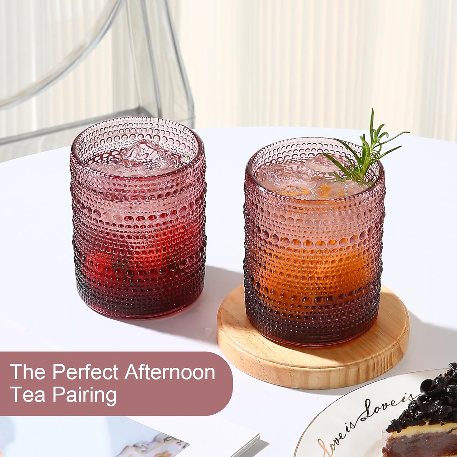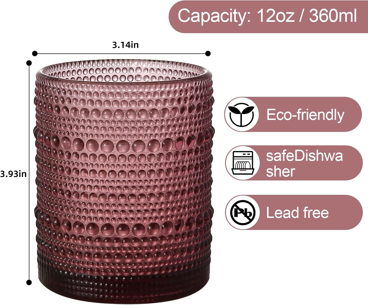 Vintage Glassware Drinking Glasses Set of 6,12 oz Hobnail Glass Cups,Embossed Purple Water Tumbler,for Beer,Cocktail,Whiskey,Juice and Various Mixed Drinks- 1 Cleaning Brush