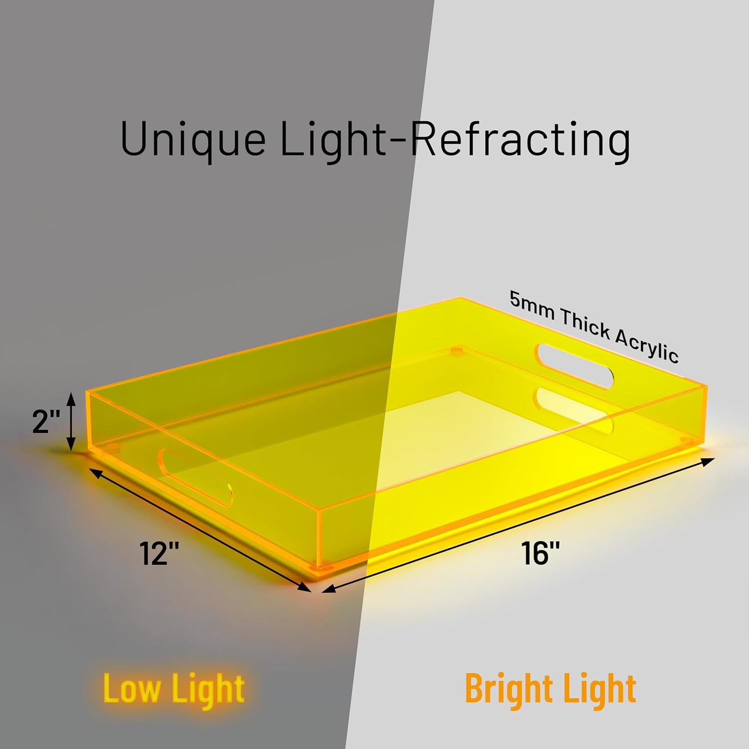 16"x12" Large Acrylic Serving Tray Decorative Ottoman Coffee Table Vanity Tray Tea Fruit Platter Snack Appetizer Dessert Drink with Handles for Bar Kitchen Party, Neon Yellow