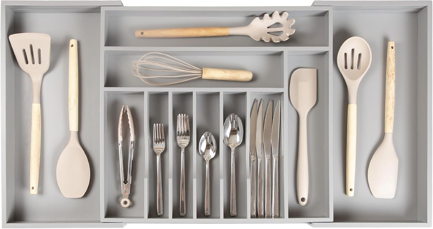 • MAXIMIZE YOUR DRAWER’S STORAGE CAPACITY: This 11-compartment (9 fixed + 2 adjustable) gray organizer measures 17.25” long x 2.7” tall and expands from 18” to 33” wide (and any width in between). Most other flatware organizers expand to 22” or 23” wide and are only 2” tall. It’s amazing how much storage capacity an extra 0.7” in height adds when filling your organizer full of flatware and utensils!