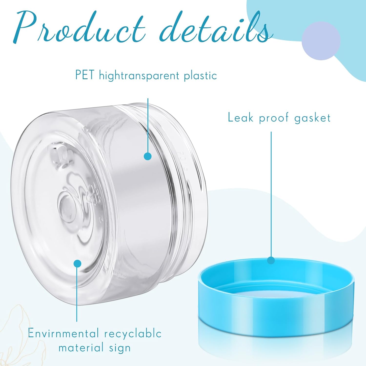 • Quality Material: the 1 oz plastic jars with lids are made of quality clear plastic, without odd smell, does not contaminate your skincare products, stable, high temperature resistance, a blue plastic cover with lid, sealed storage and leak proof