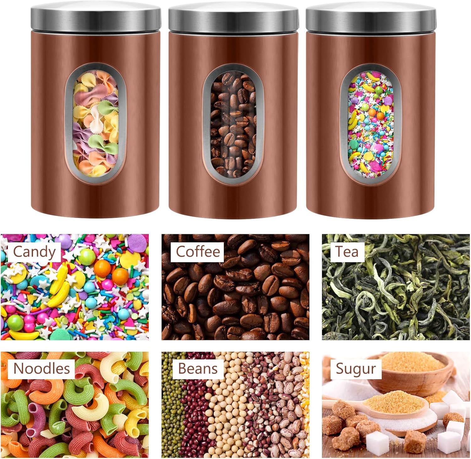 Canisters Sets for the Kitchen, 3pcs Sugar Flour Tea Coffee Storage Jars Stainless Steel Food Container Organizer for Kitchen Counter with Transparent Window (bronzy)