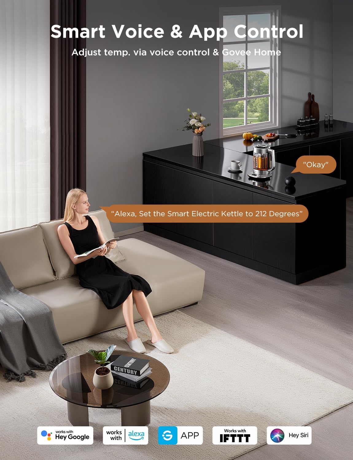 • Smart Control: Connect your electric kettle to the app to schedule and adjust the temperature anytime. When boiled you will receive a notification. You can also voice control the electric tea kettle via Alexa & Google Assistant for added convenience.
