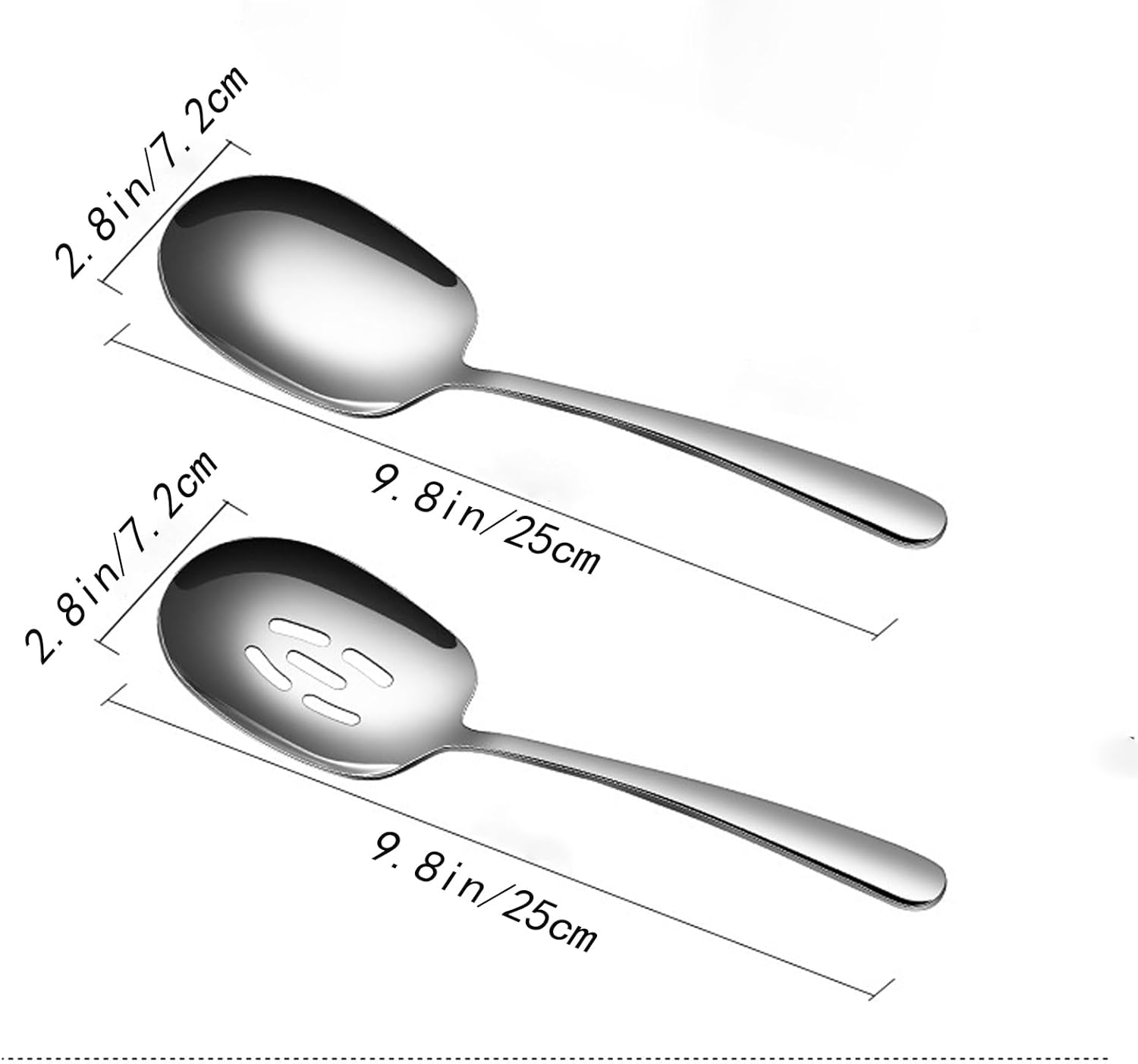 • Practical Design:- Large size serving spoons allows you to take out enough food each time. Slotted spoons can easily skim and strain unwanted fat and food remnants from the entree. Ideal spoon set for weddings, dinners, banquets, buffets or various evening parties.