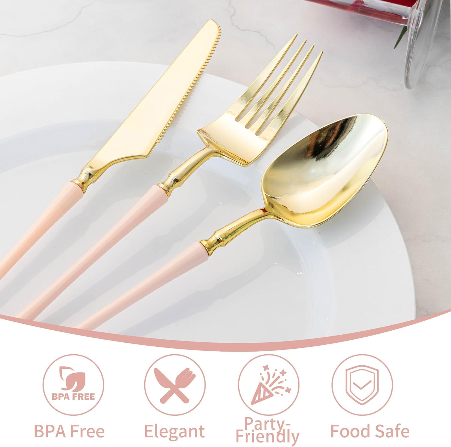 Lullaby 90pcs Gold Plastic Silverware, High End Disposable Cutlery with Pink Handle Include 30 Forks, 30 Spoons, 30 Knives, Elegant Disposable Silverware for Wedding, Party, Gathering and Daily Use