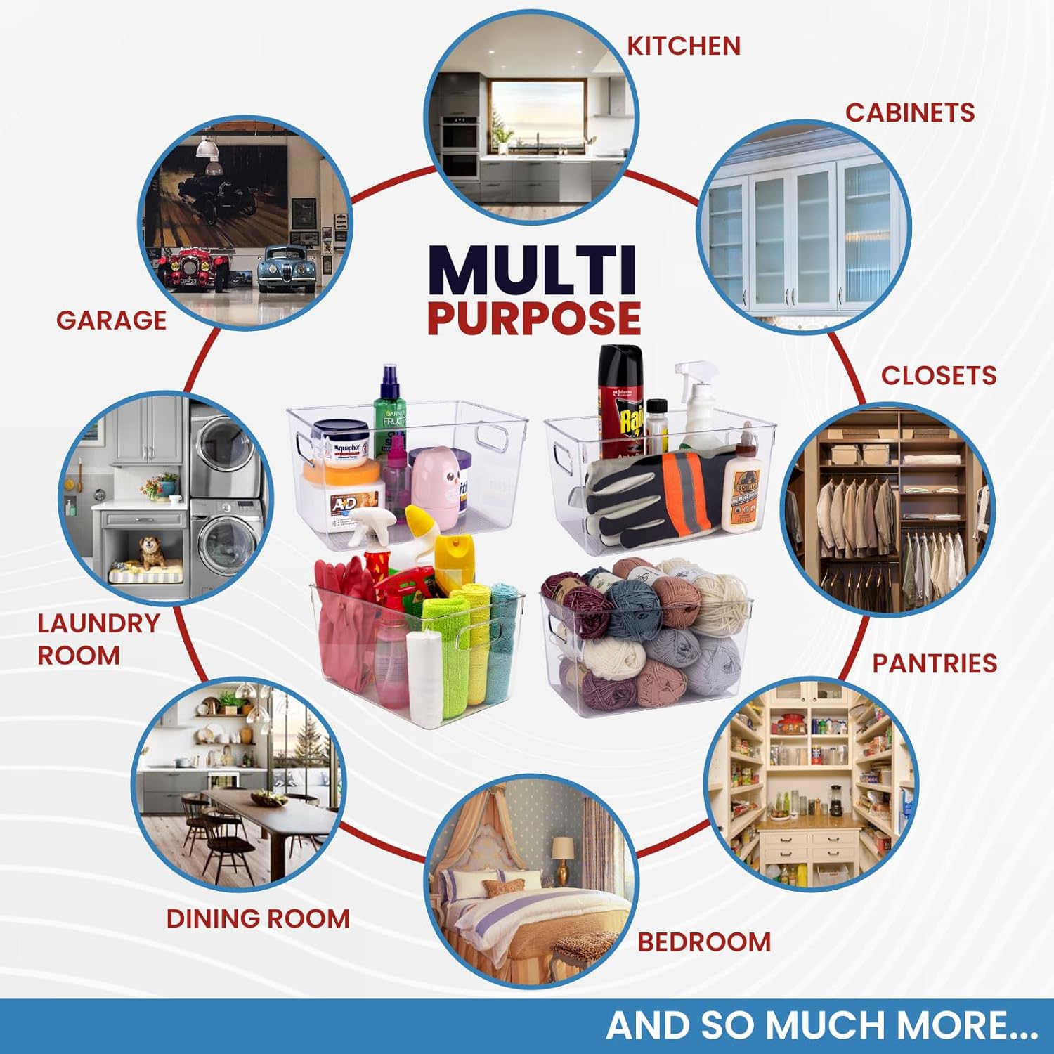 • YOU WON'T FIND A MORE VERSATILE SET OF BINS: You can use these large clear plastic storage containers with lids for organizing any space in and around your home – the kitchen, cabinets, refrigerator, closets, pantries, bedroom, dining room, laundry room, nursery, garage, kids toy room, under sink organizers and more.