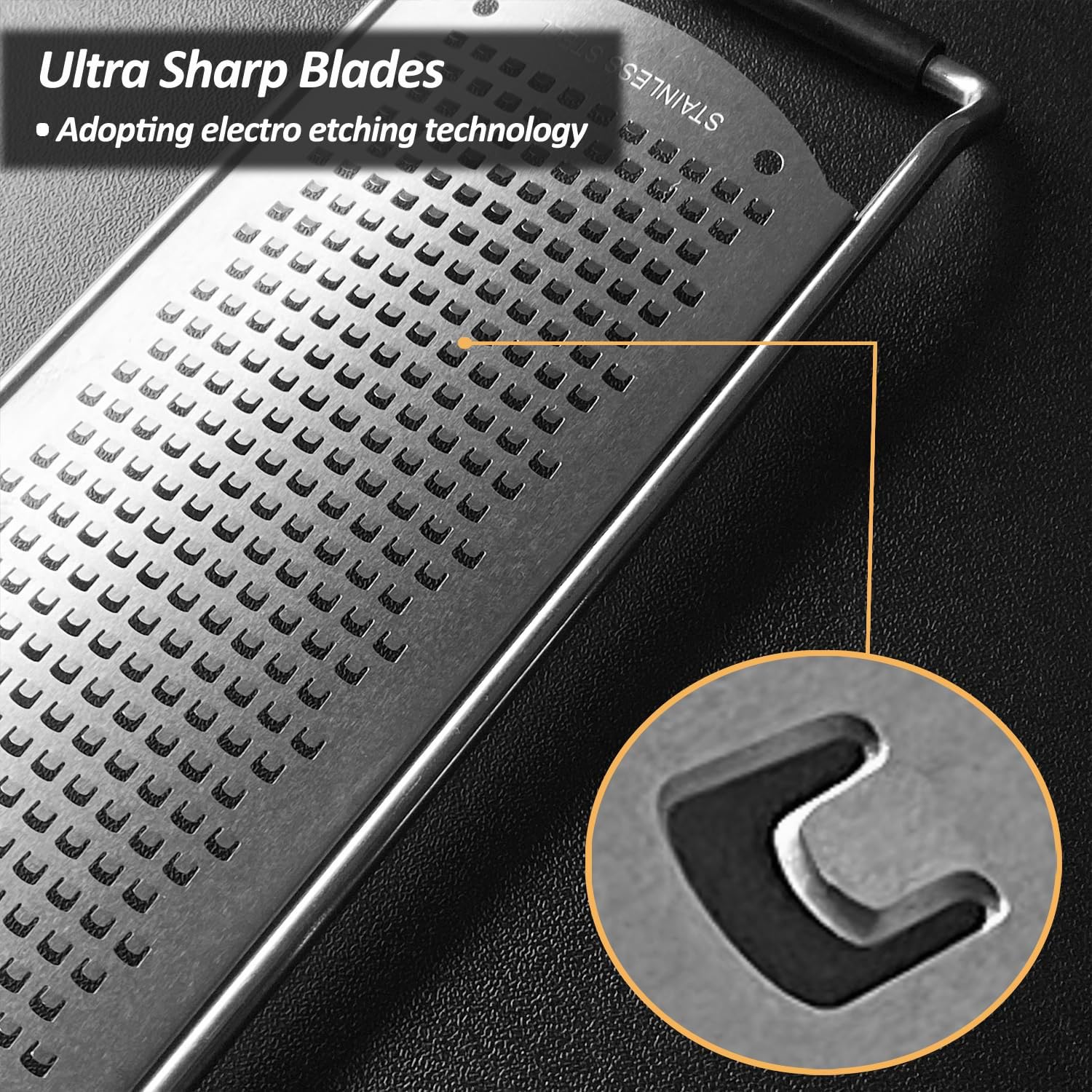 • EFFORTLESS & SAFE - The blade of this cheese grater is designed with special square blade and processed with photo-etching technology. Tough body with large size non-slip handle makes it more safe and effortless while grating. It is the better choice of grater and zester for kitchen tools