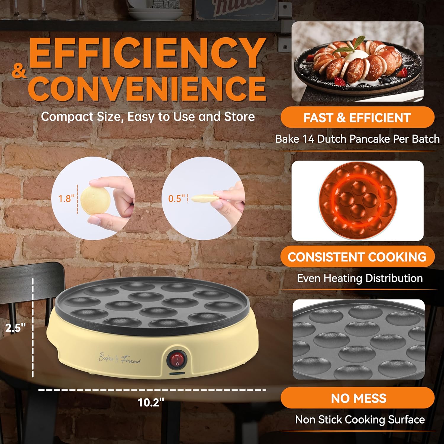 • [THE MORE THE MERRIER]: Your beloved mini dutch pancakes now available for the entire family to enjoy. With the BAKER'S FRIEND mini pancake pan, you can prepare up to 14 x 1.8’’ of your preferred poffertjes in significantly less time.