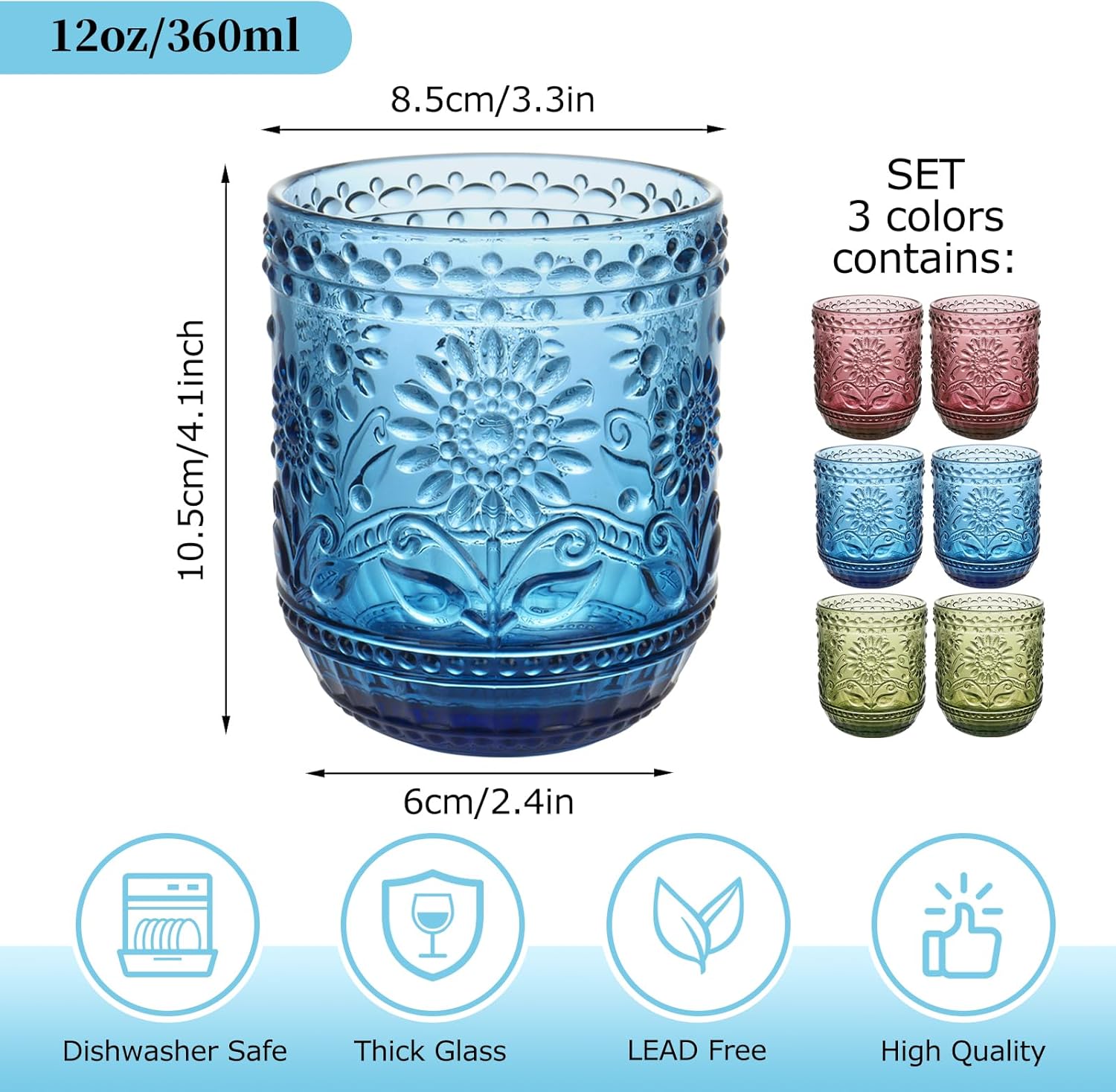 Glass Cups, Vintage Glassware Drinking Glass Set of 6, 12oz Colored Glassware with Sunflower Design, Embossed Floral Decorative Glasses Drinking Set for Cocktail, Wine, Vintage Drinking Glasses