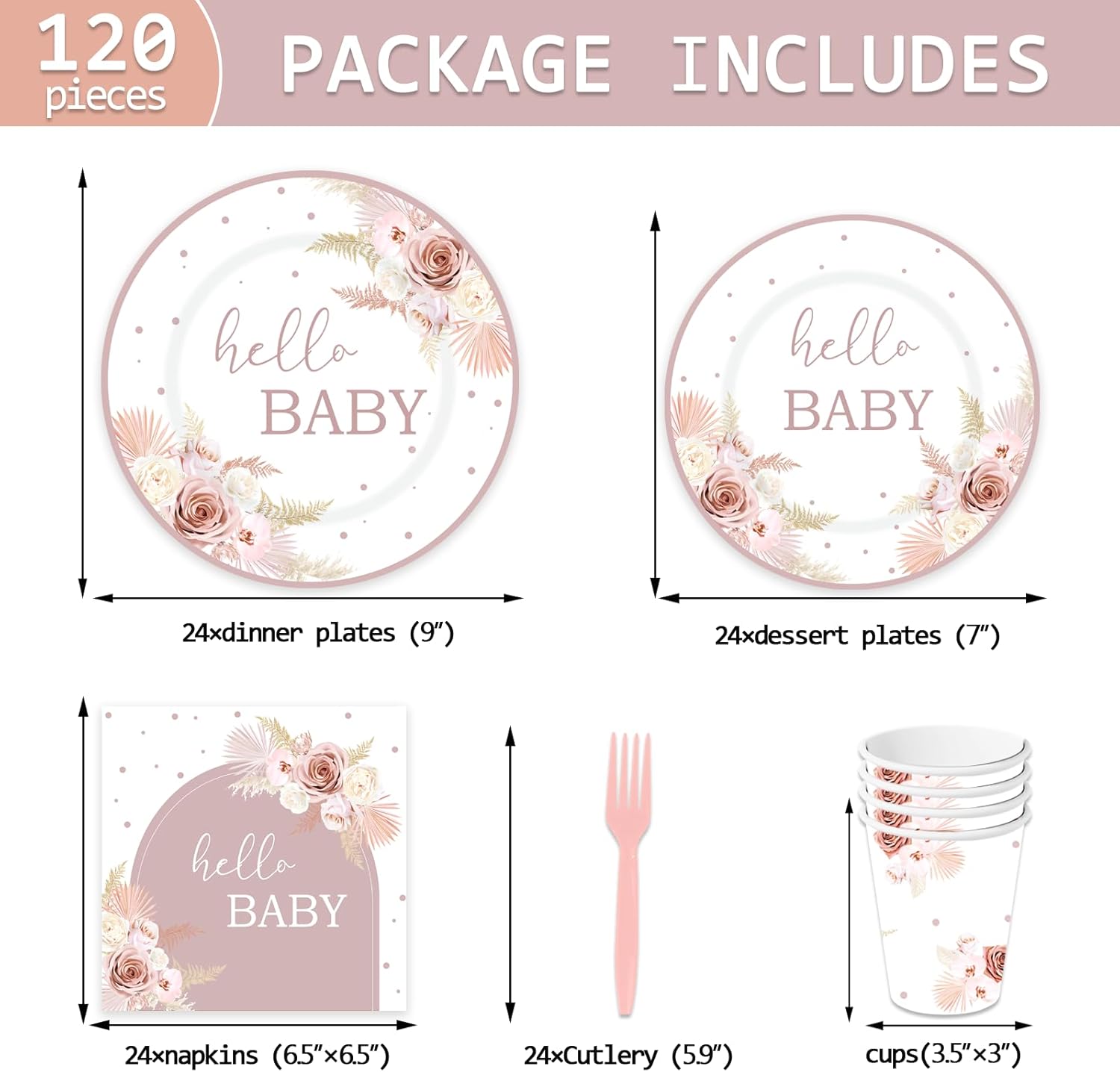 120PCS Boho Baby Shower Party Plates and Napkins Cups Hello Baby Shower Dinnerware Supplies Pampas Grass Floral Rainbow for Baby Girls Tableware Set for 24 Guests