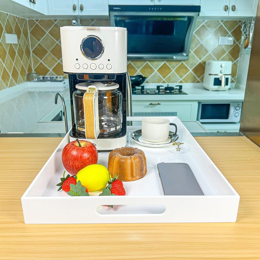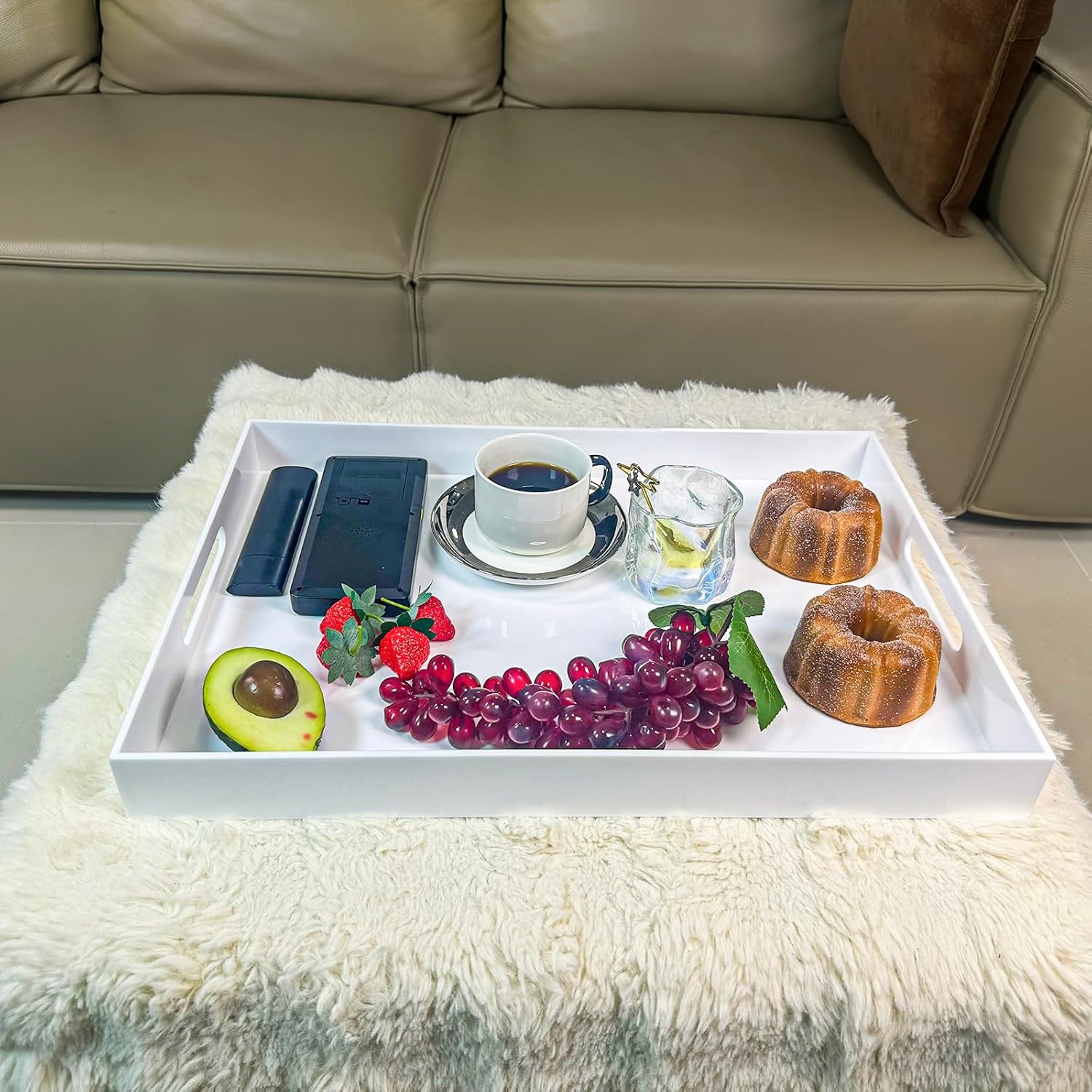 White Rectangular 14x20 Inches Acrylic Ottoman Tray Decorative Serving Tray with Cutout Handles Organizer Tray on Coffee Table Countertop Big Breakfast Bed Tray Living Room Appetizer Serving Food