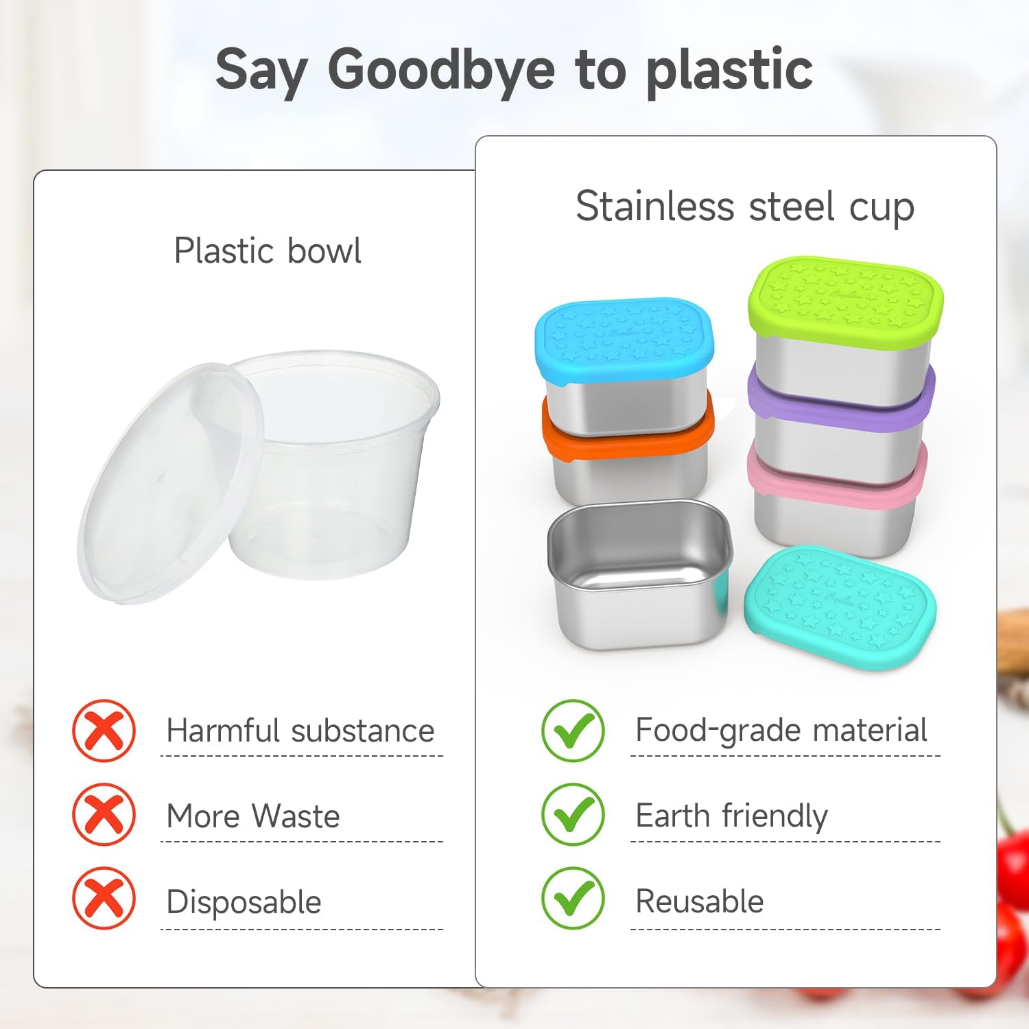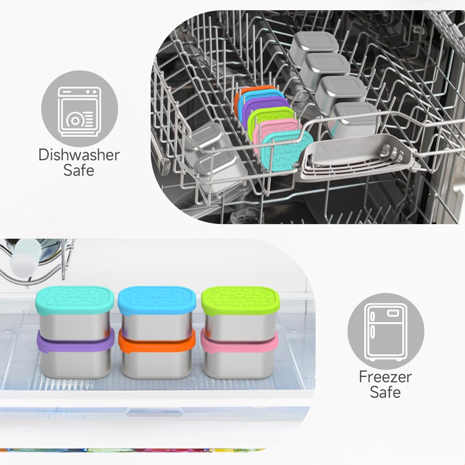 SOPHICO Stainless Steel Snack Containers for Kids, 8 oz Small Food Storage Container 1 Cup with Silicone Lid - Perfect 304 Metal Toddler Lunch Box for Daycare and School, Leak Proof (8oz, 6 Pack)