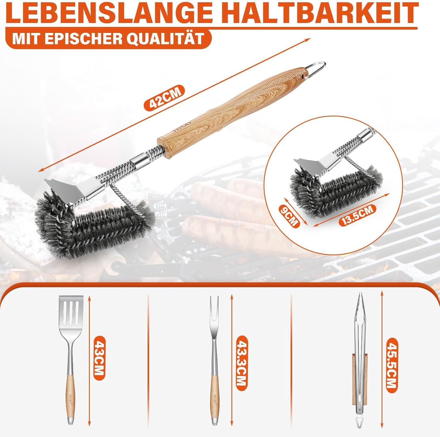 • ERGONOMIC DESIGN: Each tool in our grill set features an ergonomically oval-shaped handle that fits comfortably in your hand. The handles of each TIVOLI BBQ set are crafted from high-quality wood, providing a comfortable grip and distinctive look. Owning a TIVOLI BBQ set ensures you stand out in the crowd.