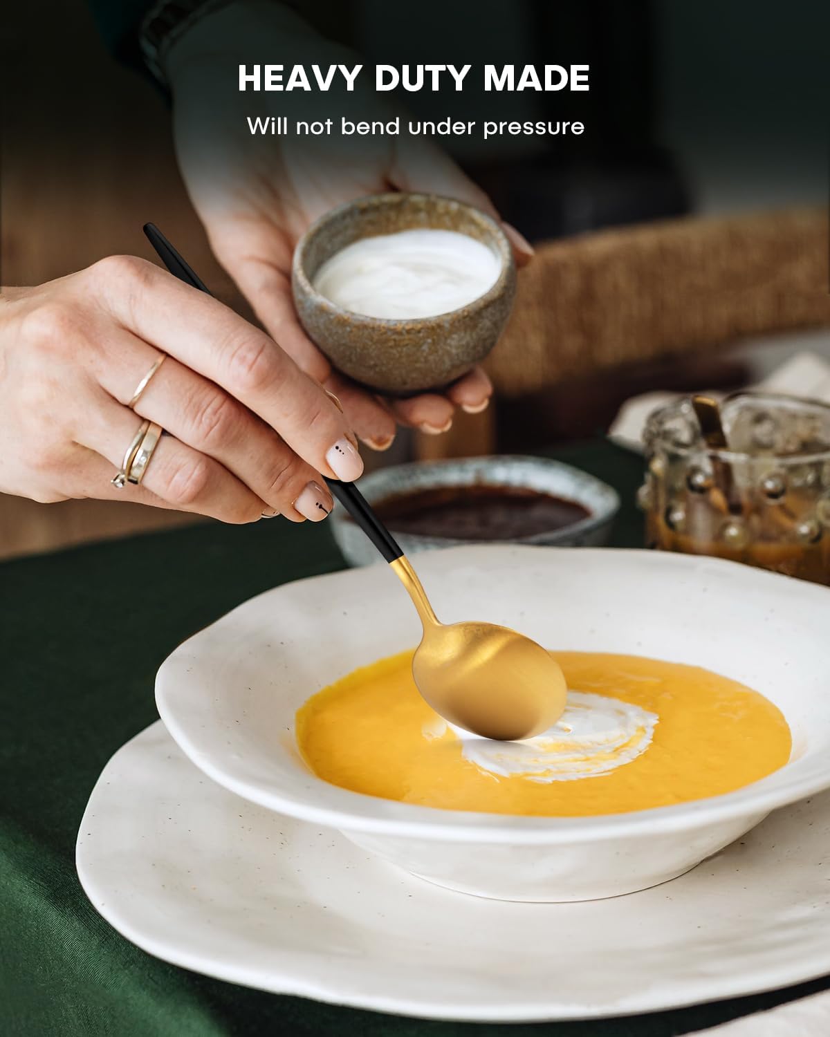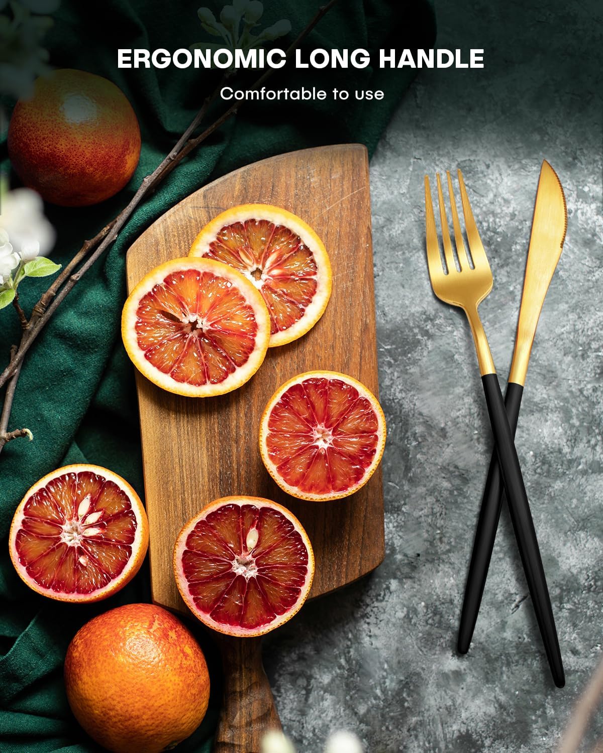• Premium Matte Black Gold Silverware Set - 40 pieces flatware set specially designed for 8 people(Includes 8 dinner forks, 8 salad forks, 8 dinner spoons, 8 teaspoons and 8 dinner knives). The matte surface makes the cutlery set more elegant, suitable for kitchens, restaurants, cafes and hotels. And it can also help your dinner full of high-end feeling while having a party.