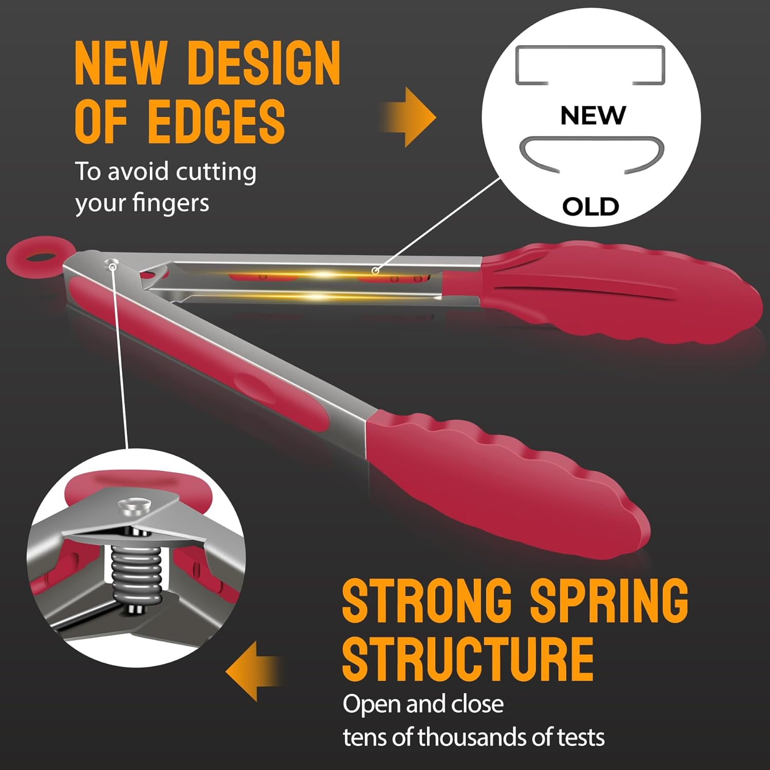 HOTEC Premium Stainless Steel Locking Kitchen Tongs with Silicon Tips, Set of 2-9" and 12"(Red)