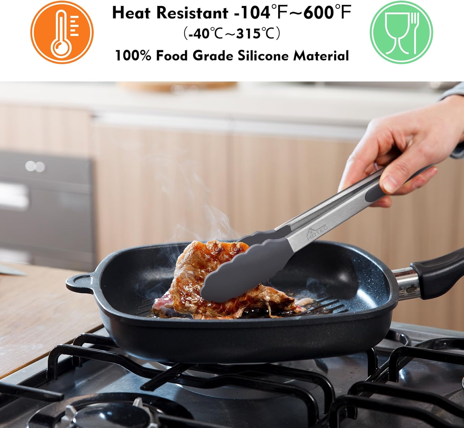 • TOP QUALITY: Hotec kitchen tongs are constructed with high quality stainless steel, sturdy, heat resistance, anti-rust, anti-corrosion, light weight, easy to handle, like new forever. This tongs for cooking comes with 3 sizes, 7 inch, 9 inch and 12 inch.