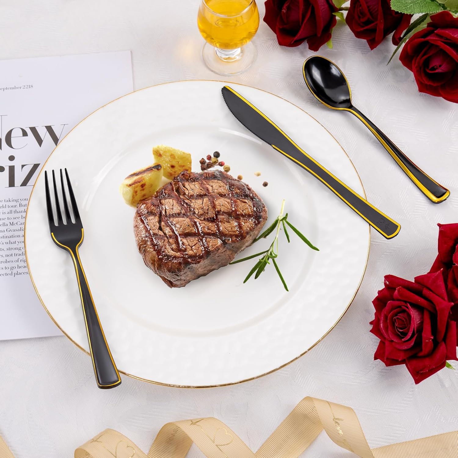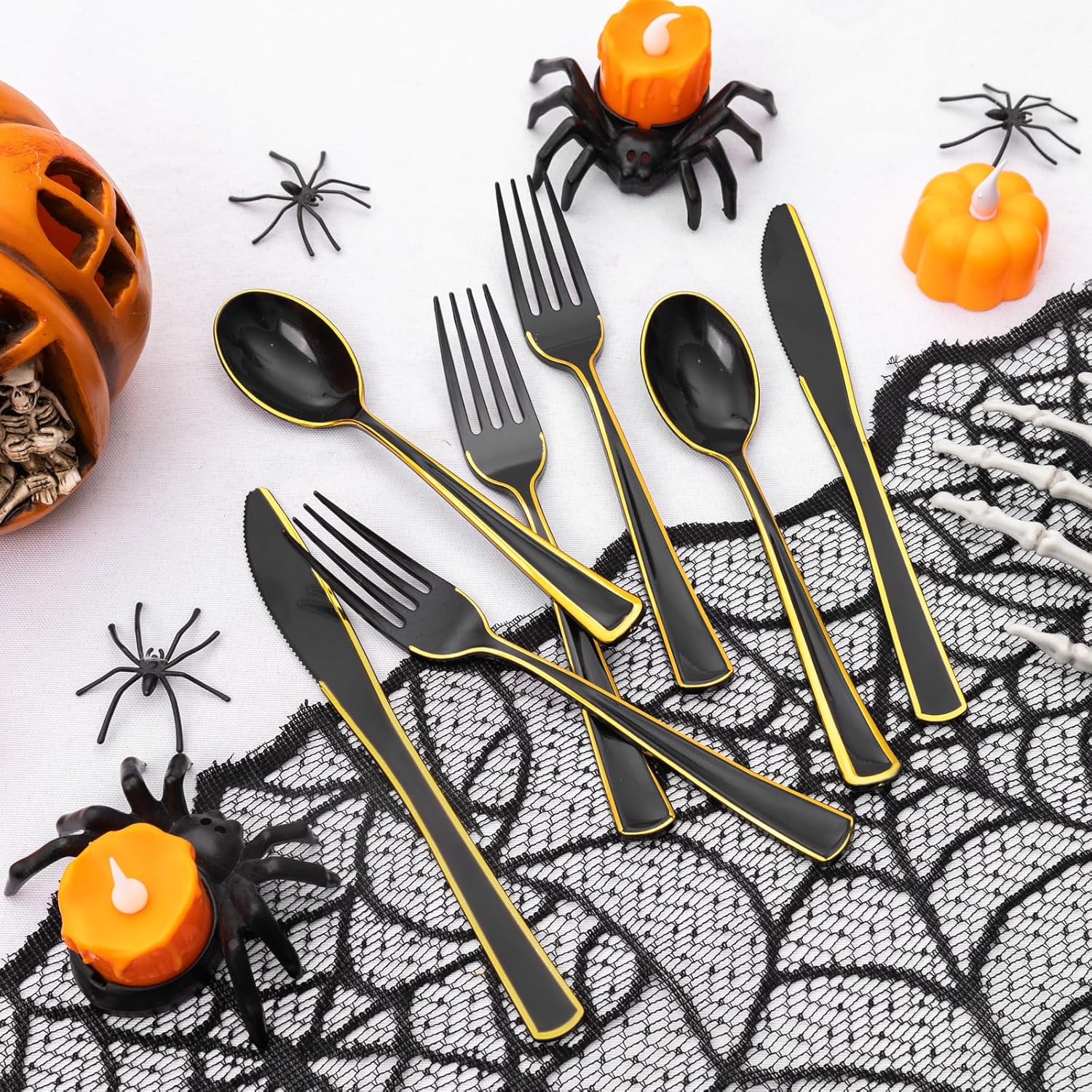 • VERSATILE USE: This black silverware set disposable are suitable for all occasions, whether it's Halloween parties, birthday parties, weddings, receptions, formal dinners, or everyday picnics and informal events. All of our black and gold utensils will add a touch of glamour.