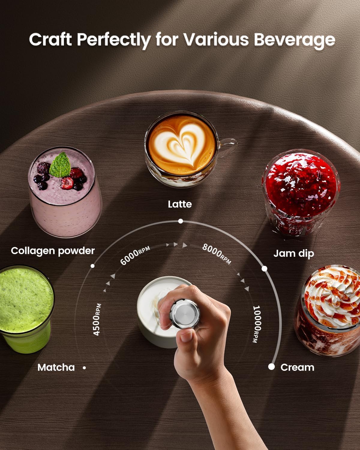 • 【Stepless Speed Control Design】Unlike traditional button-operated milk frother, this LunaFro Max electric milk frother allows you to seamlessly adjust the frothing speed with unparalleled precision, ranging from 4500RPM to 10000RPM, simply by toggling the rotary switch. Experience the ultimate control as you craft the perfect froth for different beverages. Say goodbye to splashes and lackluster froth.