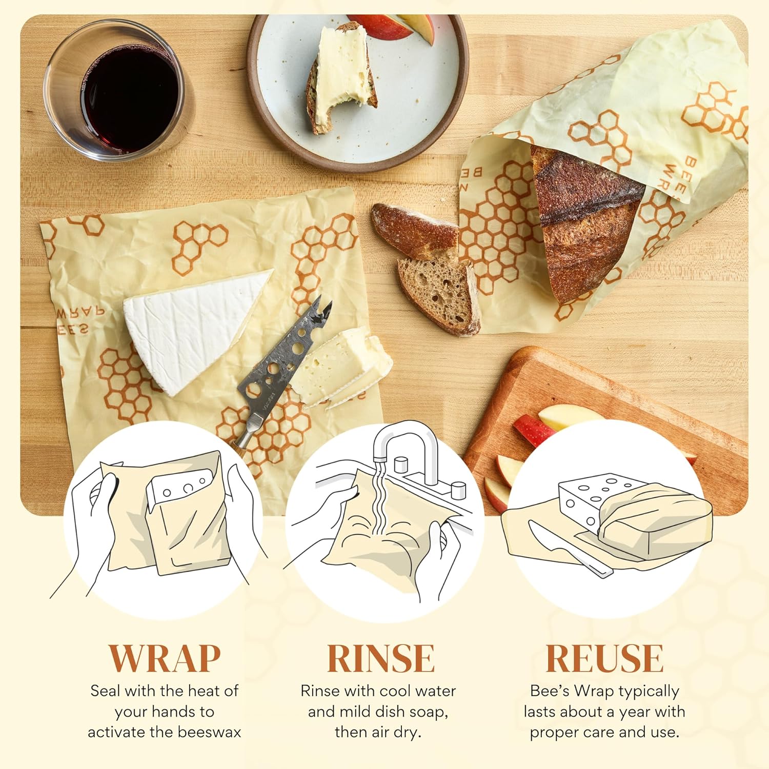• BEESWAX WRAP is simple to use: warm with your hands to create a moldable, self-adhering seal that keeps food fresh. Hand wash with cool water and mild soap, air dry, and reuse for up to a year with proper care. Bee's Wrap can be composted or used as a fire starter; true zero waste living.