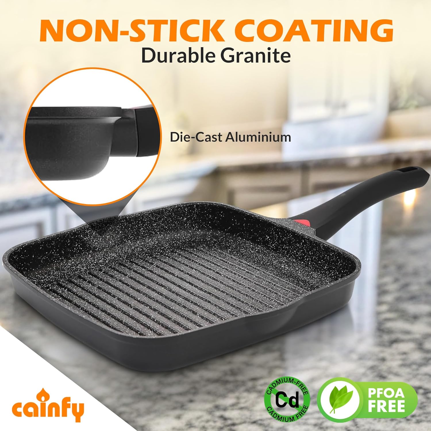 • Versatile Cooking: Discover the ultimate flexibility with our grill pans, ideal for transforming any stovetop into a grilling paradise. This frying pan features a durable granite non-stick coating that is PFOA, lead, and cadmium free for superior release and easy cleanup.