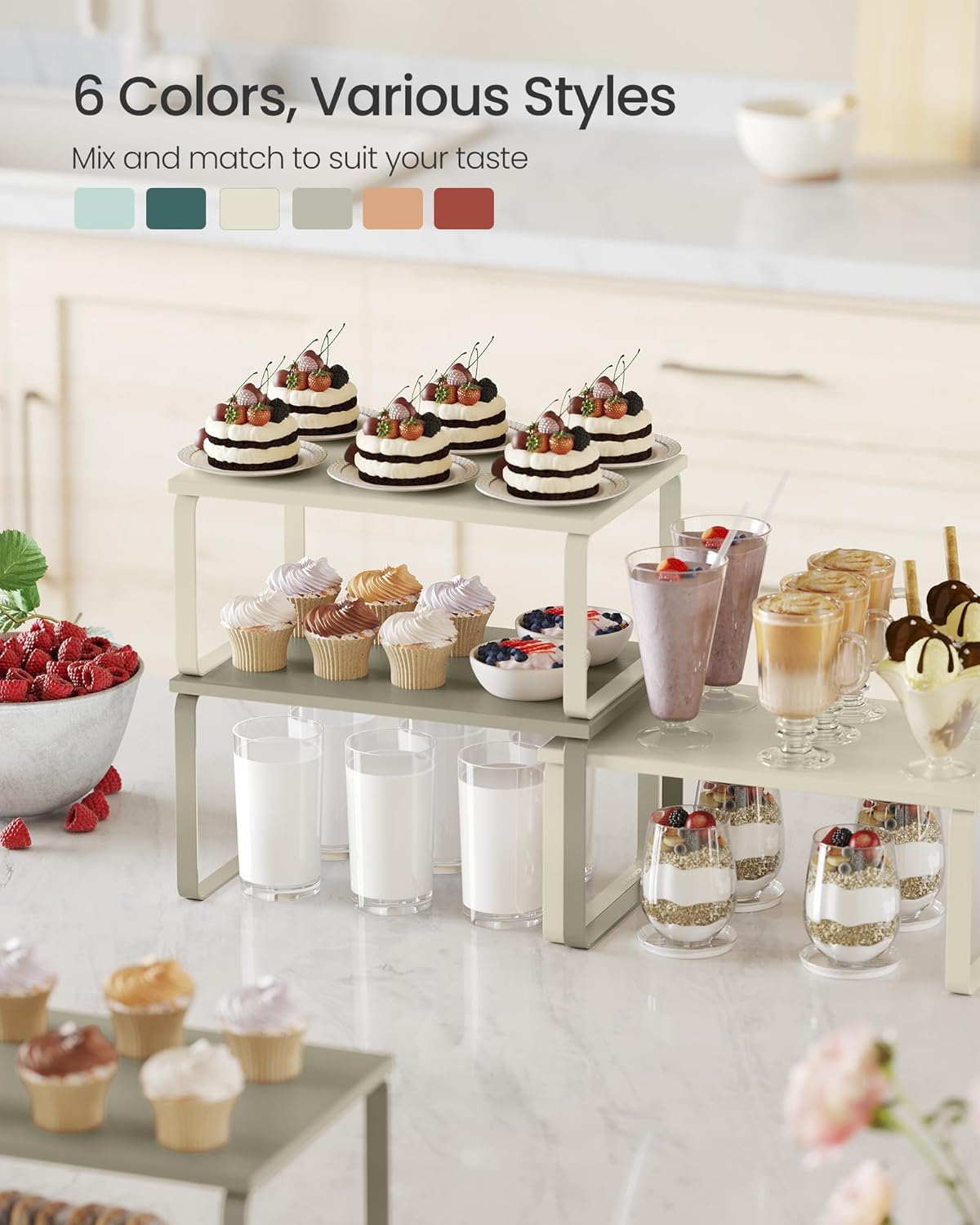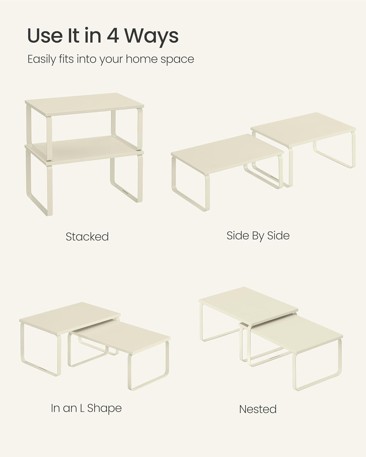 SONGMICS Cabinet Organizer Shelf, Set of 2 Kitchen Counter Shelves, Kitchen Storage, Spice Rack, Stackable, Expandable, Metal and Engineered Wood, Cream White UKCS002W02
