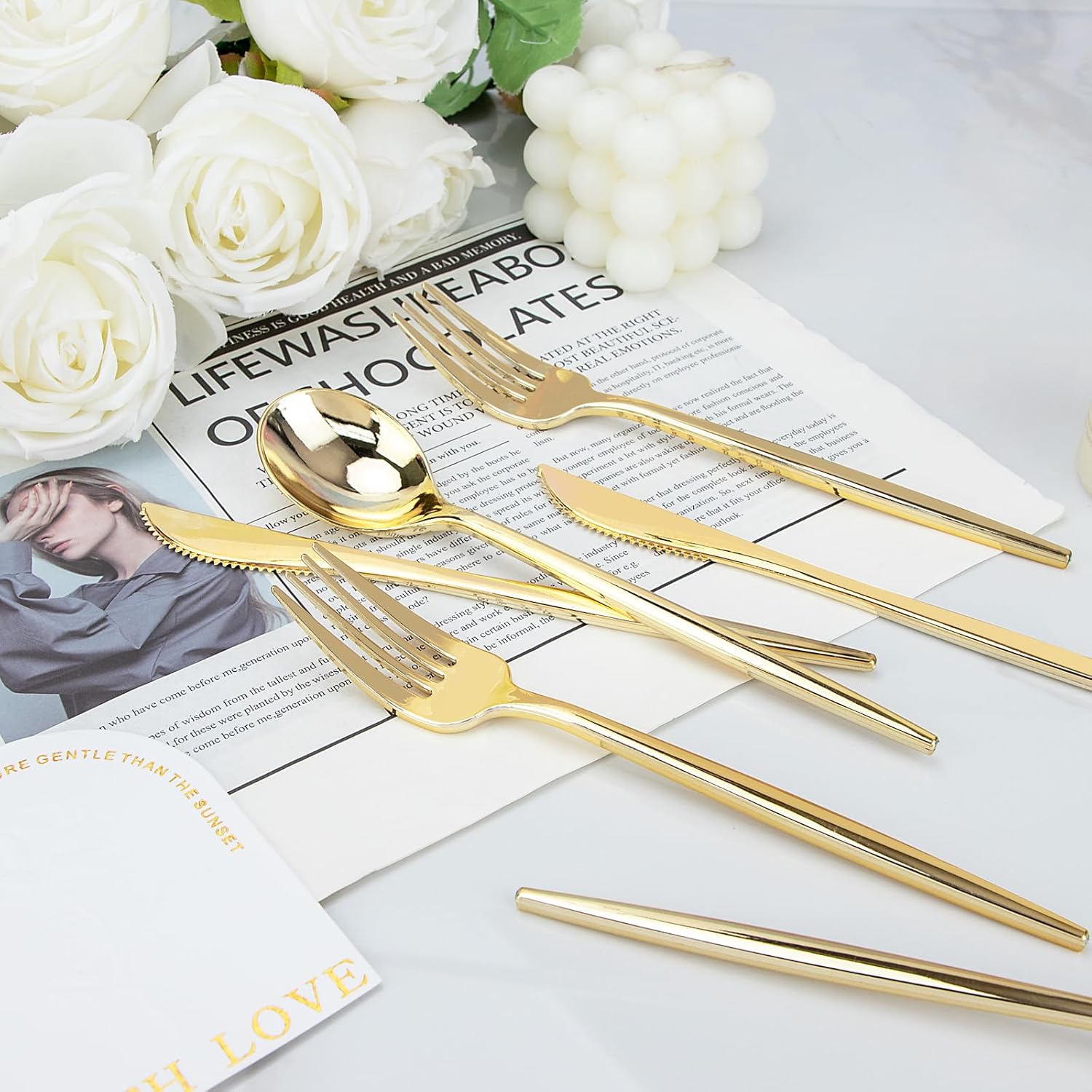 PULOTE 150PCS Gold Plastic Silverware Disposable - Heavy Duty Gold Plastic Cutlery - Gold Plastic Utensils Set Include 50 Knives,50 Forks,50 Spoons for Party&Wedding