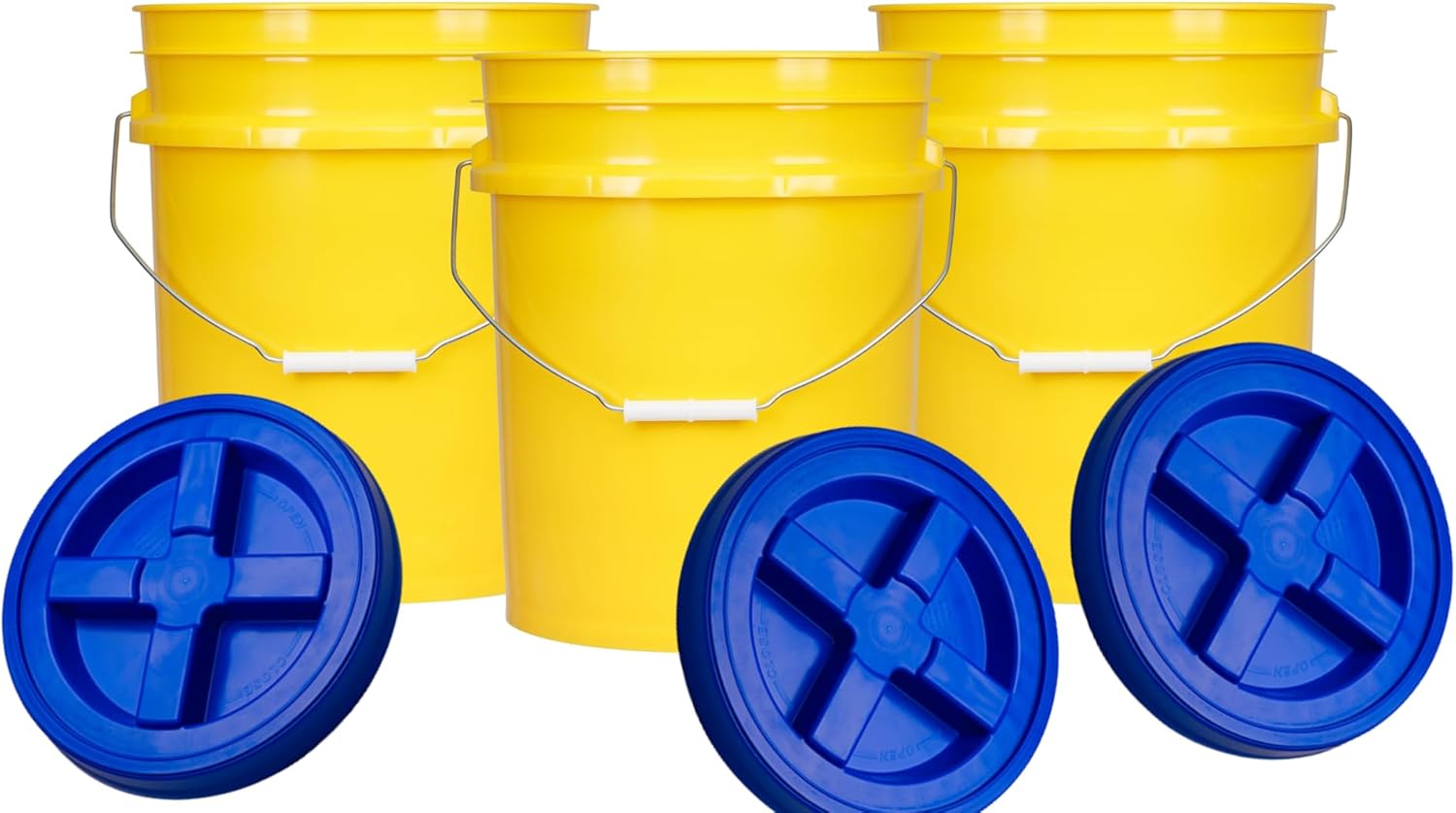 House Naturals 5 Gallon Plastic Yellow Food Grade BPA Free Made in USA Bucket Pail with Air Tight Double Gasket Screw on Lid(Pack of 3) (Yellow and Blue lids)