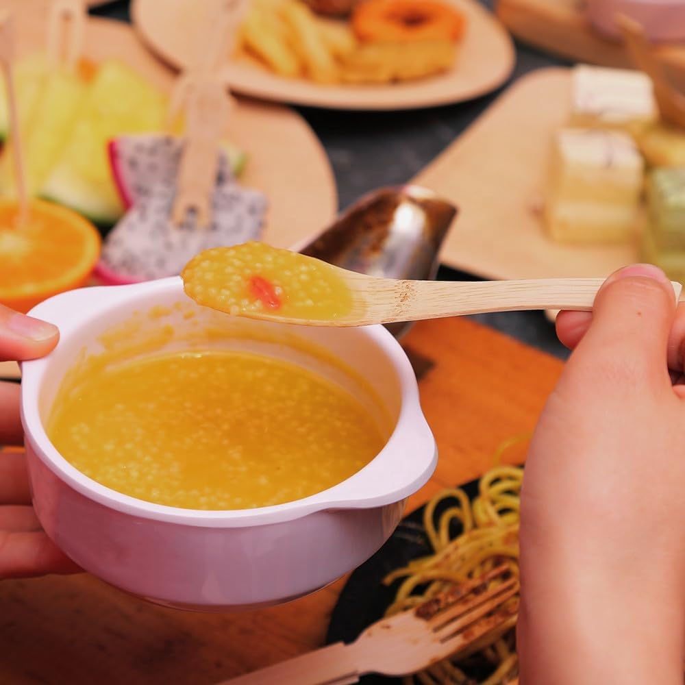 • ♻【Natural】 Made from pure natural bamboo, these spoons have a unique scent that adds a fun and interesting touch to your food. Our disposable cutlery/dinnerware provides the same reliable strength and sturdy function as traditional dinnerware but without any plastic. The smooth texture feels better in the mouth compared to wood.