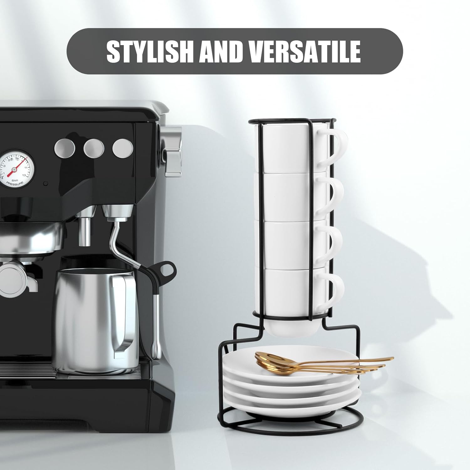 • Multi-functional Set: We've thoughtfully included saucers and spoons with each set of cups, making it convenient for you to enjoy your coffee without worrying about dirtying the table or searching for a coffee stirring tool. Plus, we've added a metal rack as a bonus, allowing you to easily organize this entire set of small coffee mug
