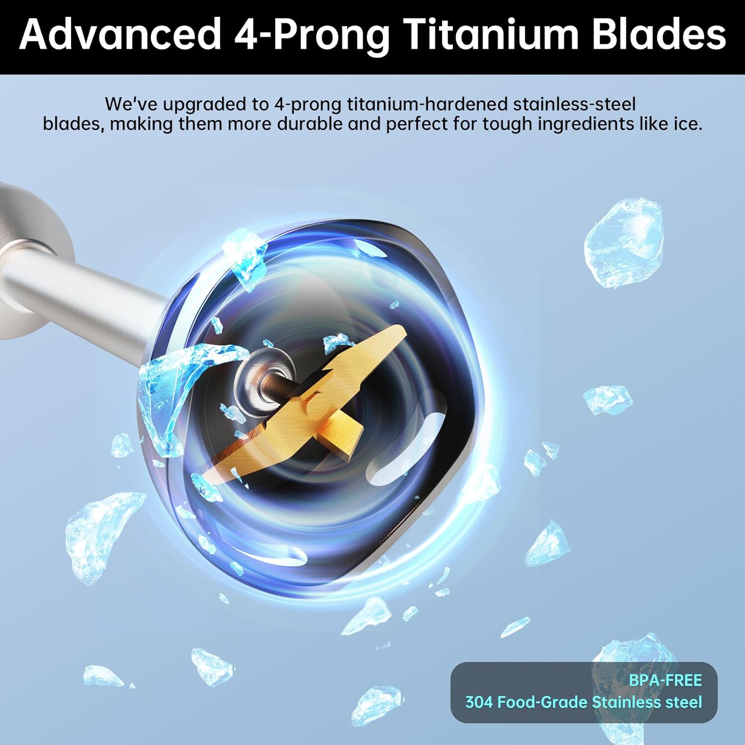 • HIGH POWER & UNIQUE BLADES ENSURE CONSISTENT SMOOTH RESULTS: Smoothies taste better when adding ice cubes and frozen fruits. That's why our immersion blender has distinctive 4-prong Titanium steel blades with a curve design and a powerful 1000-watt motor to help blend hard ingredients and deliver consistently smooth results.