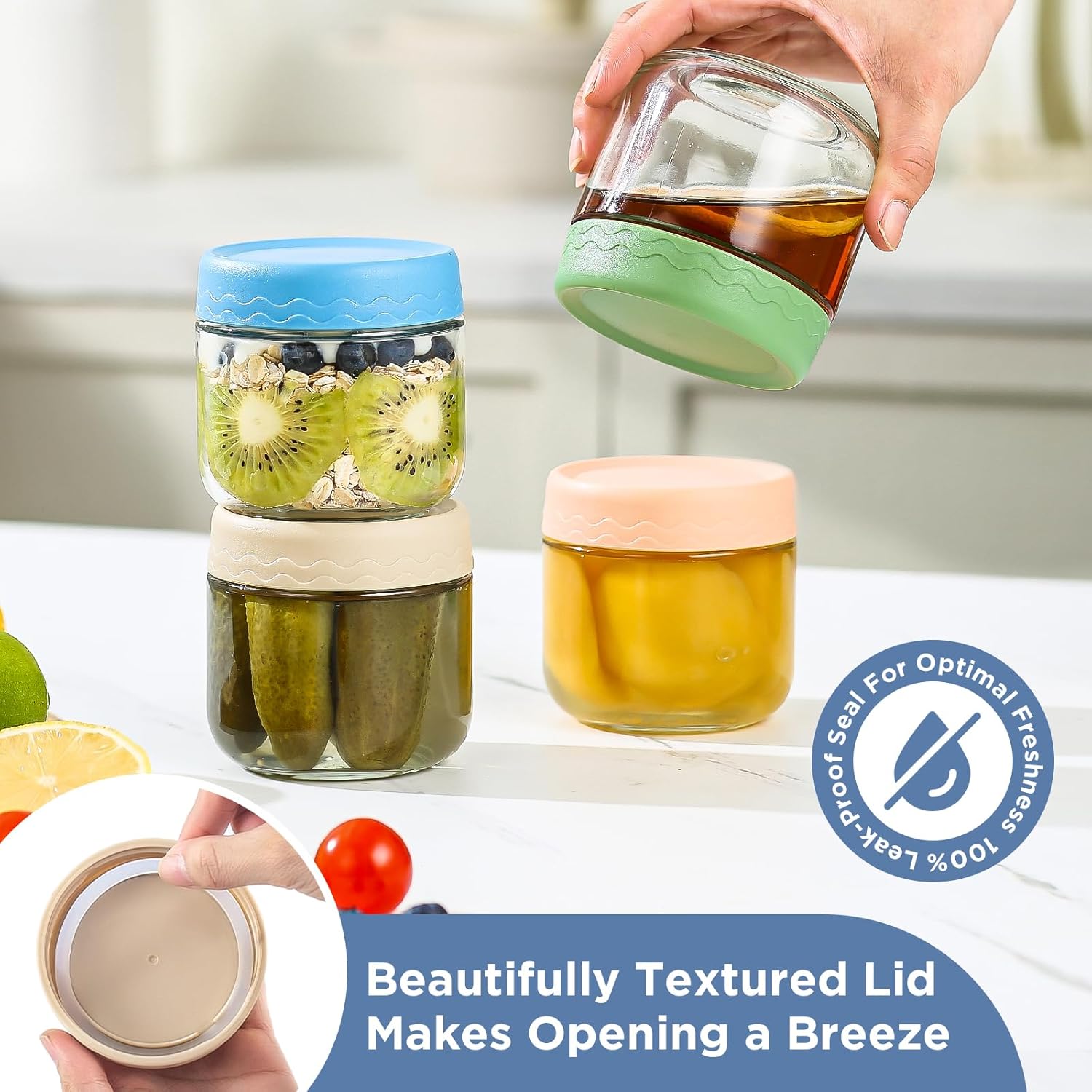• 100% FRESH AND SEALED: Our glass containers feature innovative lids that ensure exceptional sealing, keeping contents fresh longer and preventing leaks. Designed for durability in low temperatures, they are ideal for travel, as well as fridge and freezer storage. The textured lids not only add aesthetic appeal but also enhance grip, allowing easy opening even when frozen.