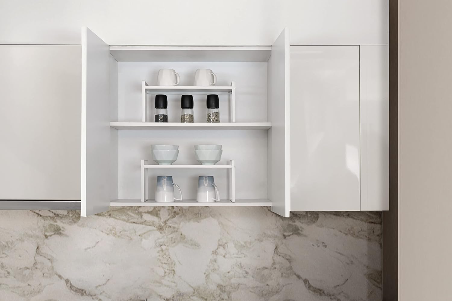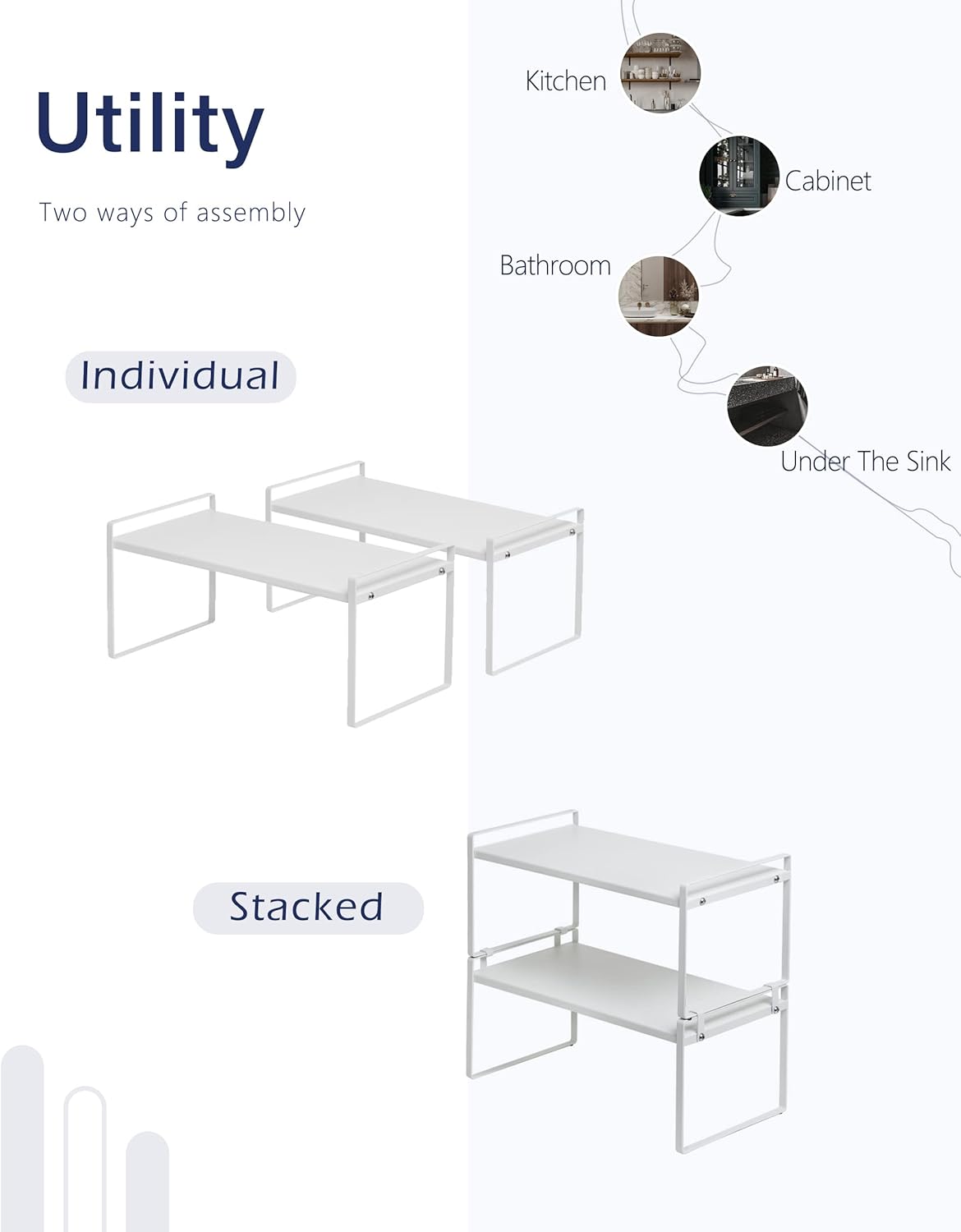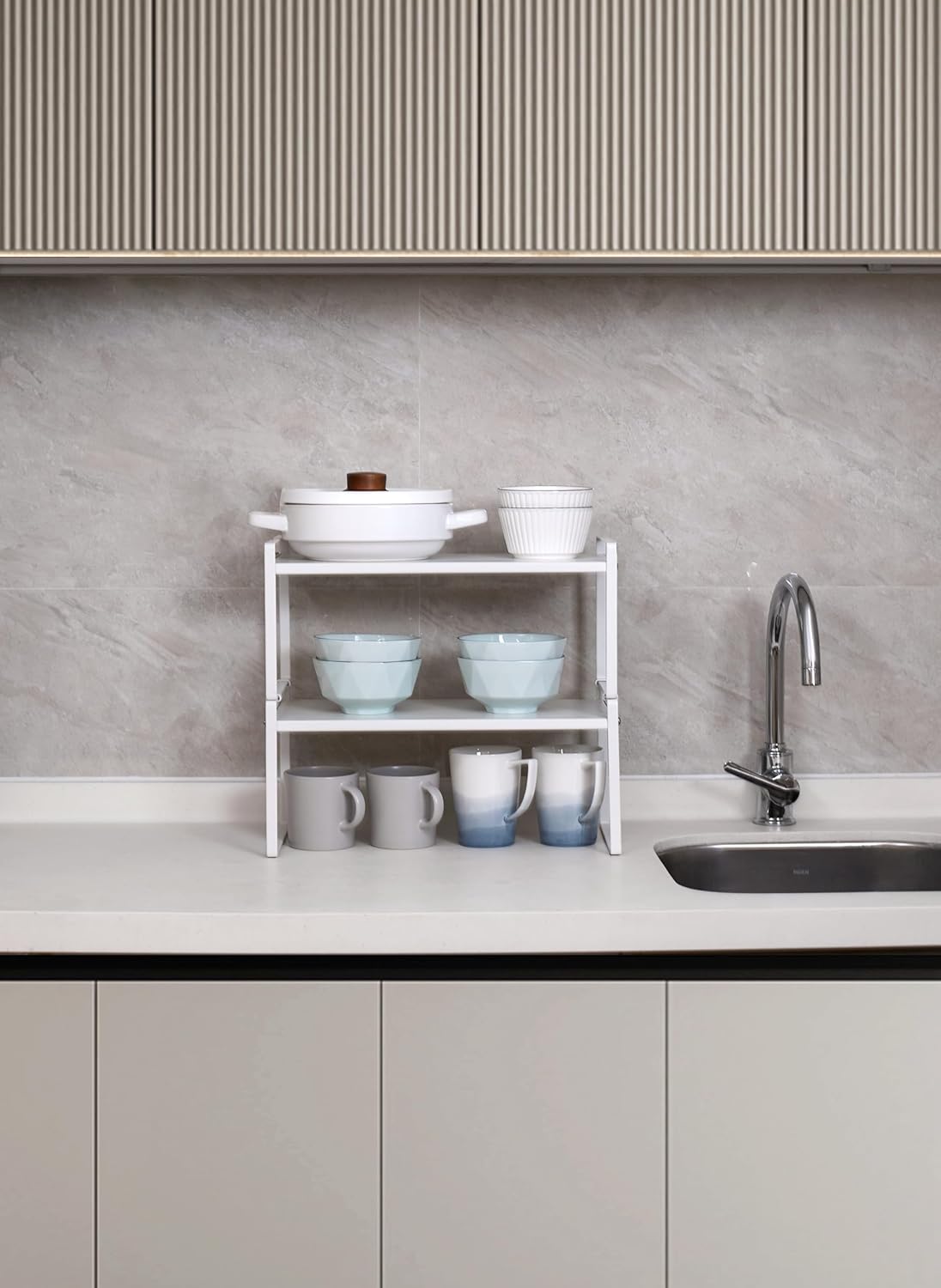 • CHARACTER DESIGN: This cabinet shelf can create plenty of space for your household items such as cups, pots, bottles, bowls, cookware, or canned foods without dominating space in your cabinet. This stylish cabinet shelf fits neatly on the countertop to keep your essentials organized and easily accessible.