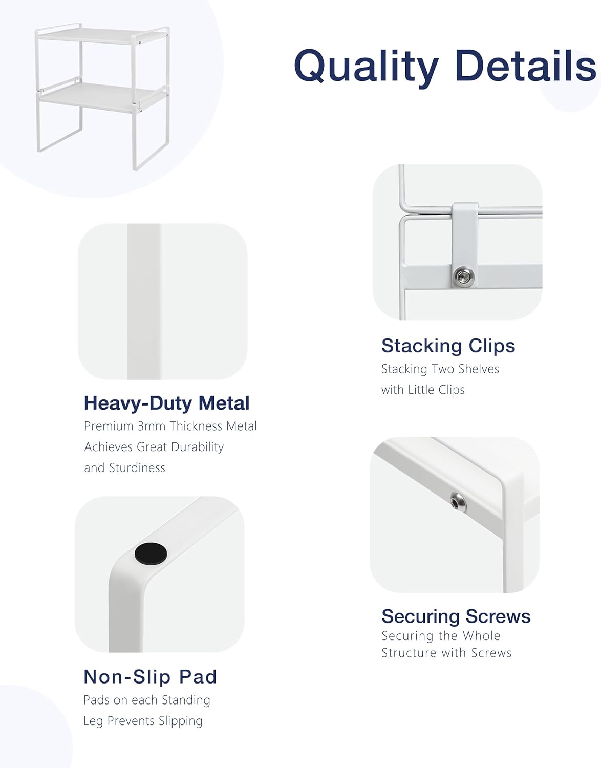 Nxconsu 2Pack Cabinet Shelves Stackable Shelf Organizer Rack Riser for Kitchen Cabinet Pantry Cupboard Counter Countertop Home Organization Storage Space Saver Heavy Duty Metal Nonslip White Wide Tall