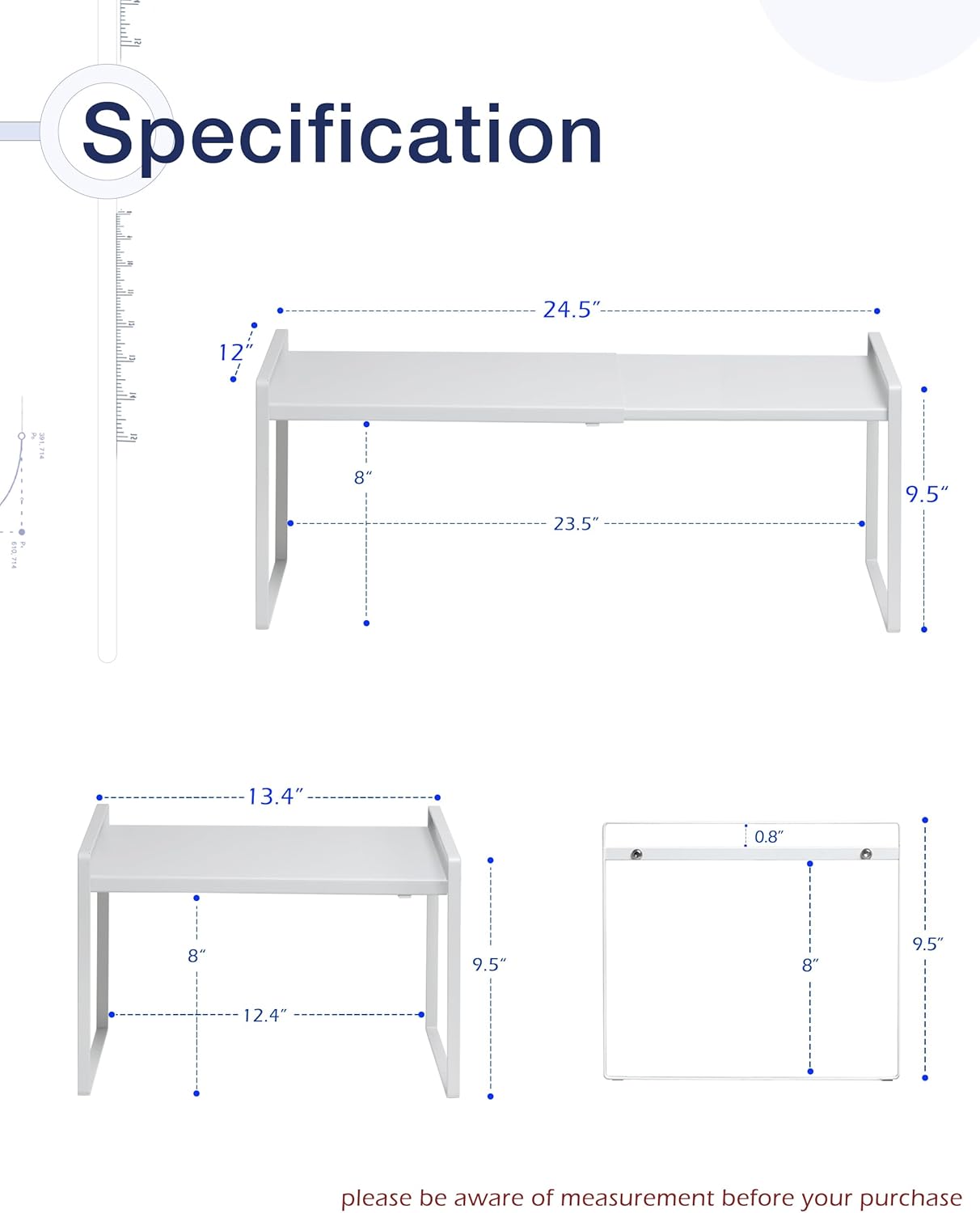• EXPANDABLE: You may expand the width of this freestanding cabinet shelf to your desires. It can easily vary from 13.4 inches to 24.5 inches in width depending on how you want to organize your space. Specification: 12’’D * 13.4-24.5’’W * 9.5’’H