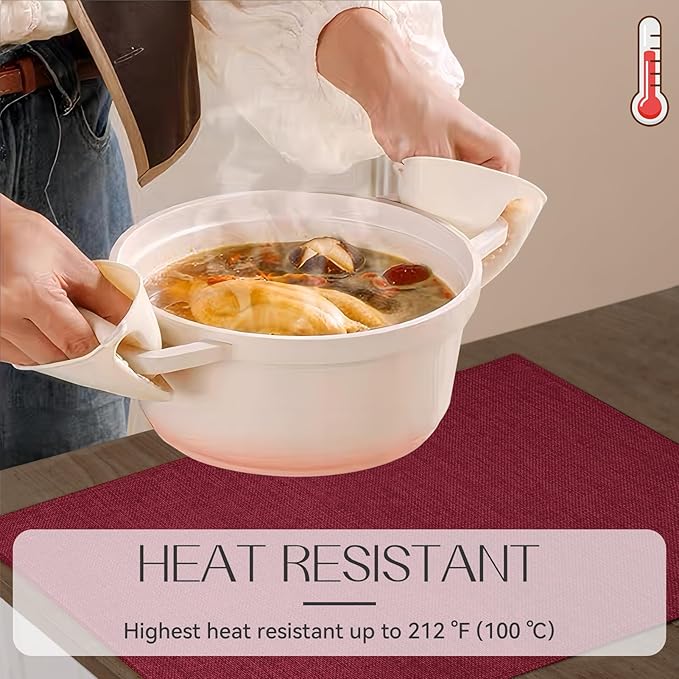 • THICKENED AND HEAT-RESISTANT: Our placemats feature a double-layered faux linen fabric which is heat-resistant up to 220°F (100°C) . They will prevent hot dishes, stains, and scratches from damaging your tables or furniture.