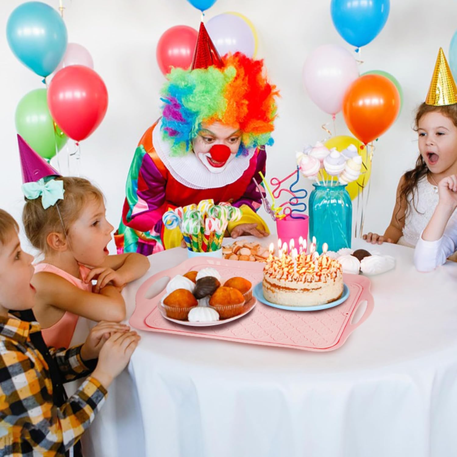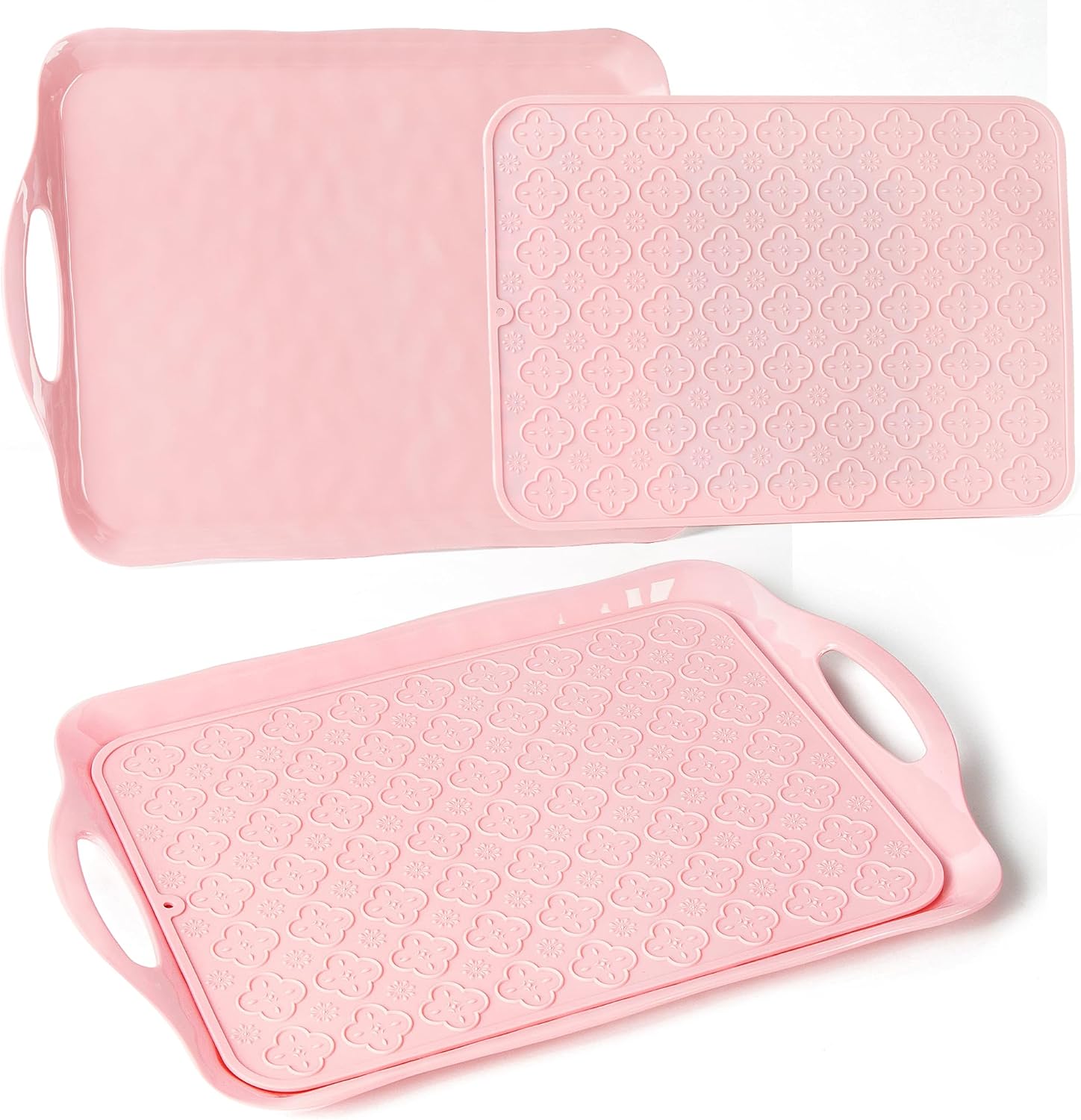LEHAHA Melamine Serving Tray with Handles, 17.25 x 12 Inch Aesthetic Serving Platters and Trays with Curved Sides, Tray for Lunch, Coffee, or Breakfast, Set of 4, Silicone placemats Included,Pink