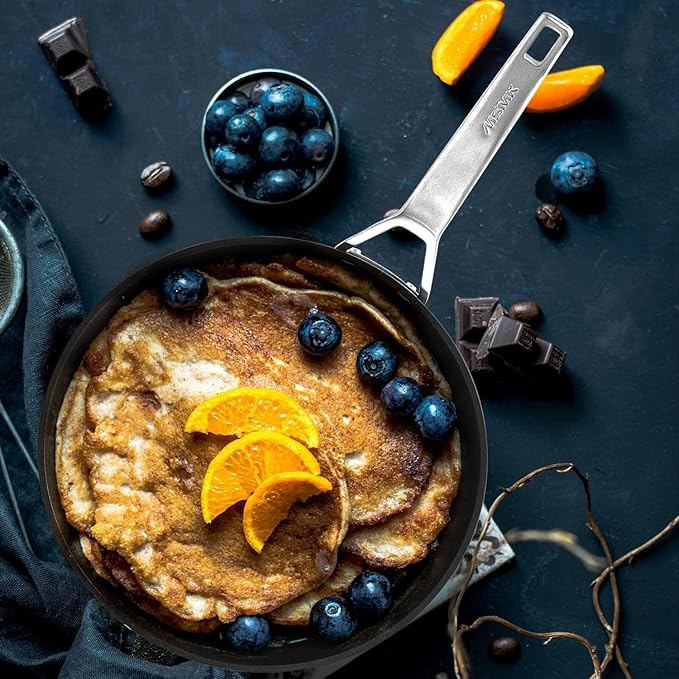 • DURABLE & LONG-LASTING:Lasts for 20 years with 5 times of frying Steak and Bacon every day. Titanium non-stick coating from Germany, USA and GRE TUV approved, PFOA FREE, no nickel, lead and other heavy metals, safe for children
