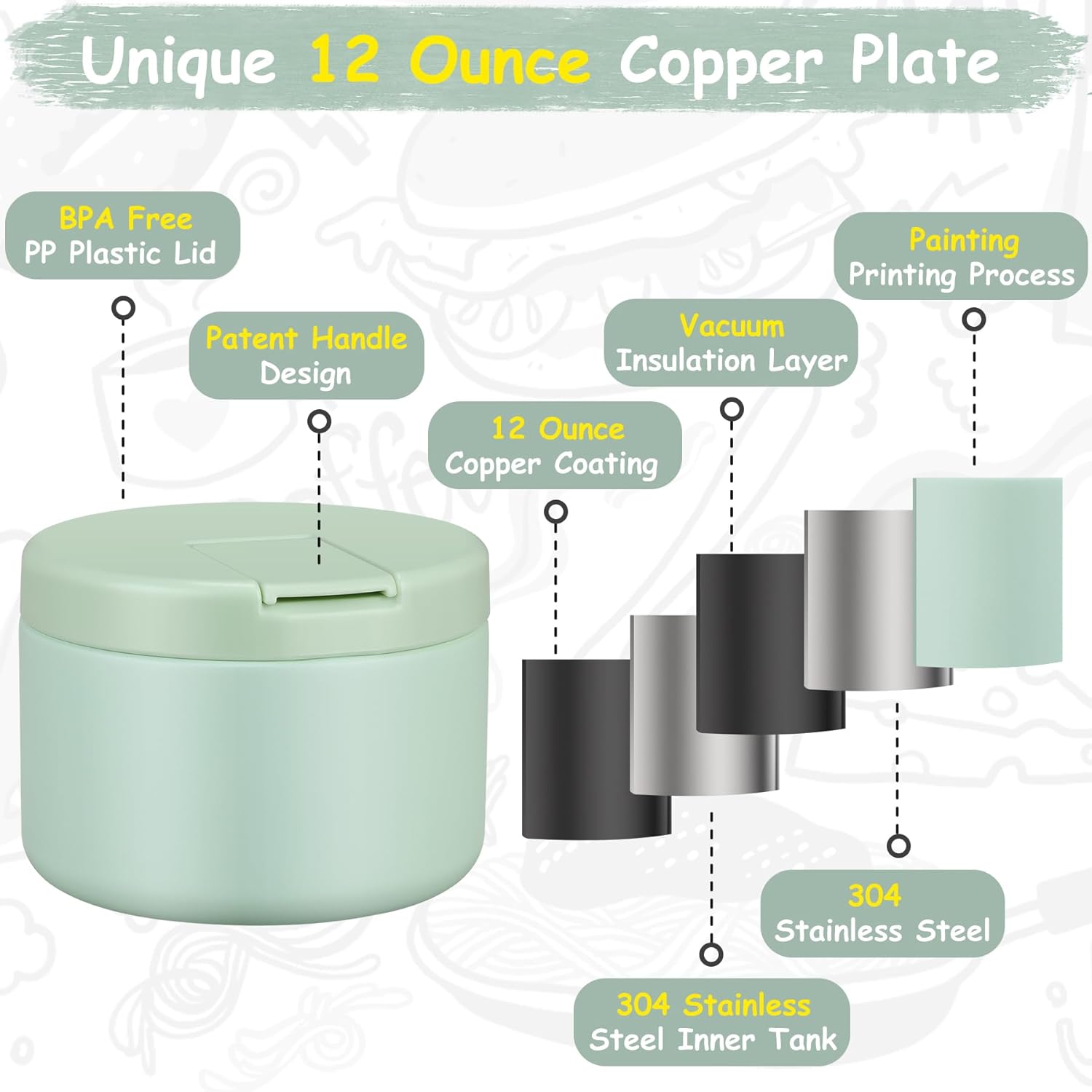 • Keep Food Warm and Cold: Our soup thermo with the insulated 18/8 (SUS304) stainless steel interior with vacuum seal.This will keep your little kids meals warm or cool for 5+ hours. Capacity: 12oz(350ml). Small size and light weight, suitable for home, work or picnic etc.