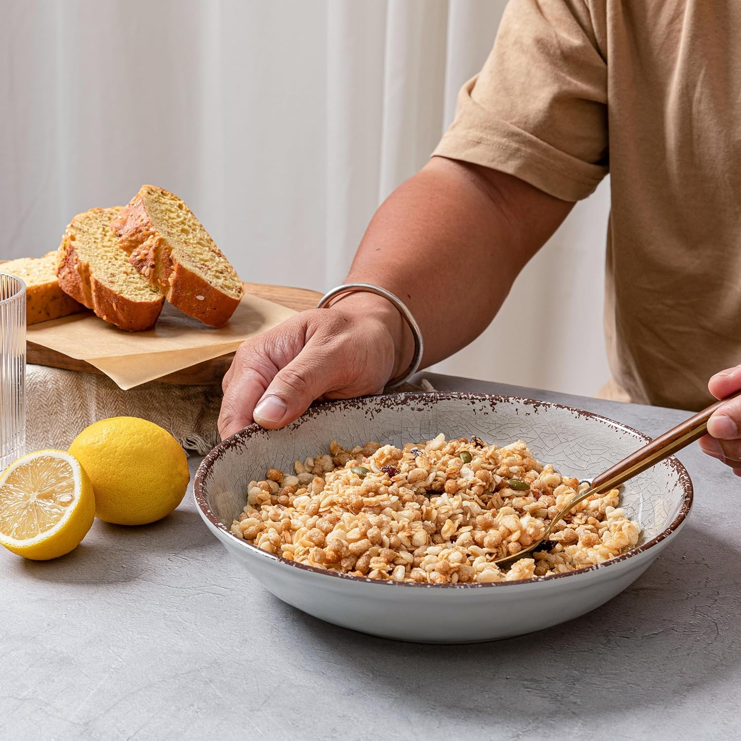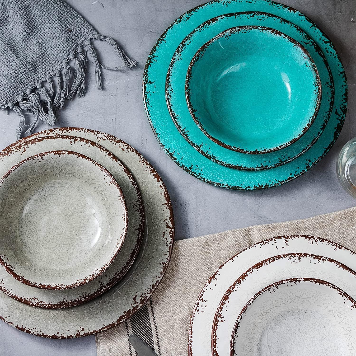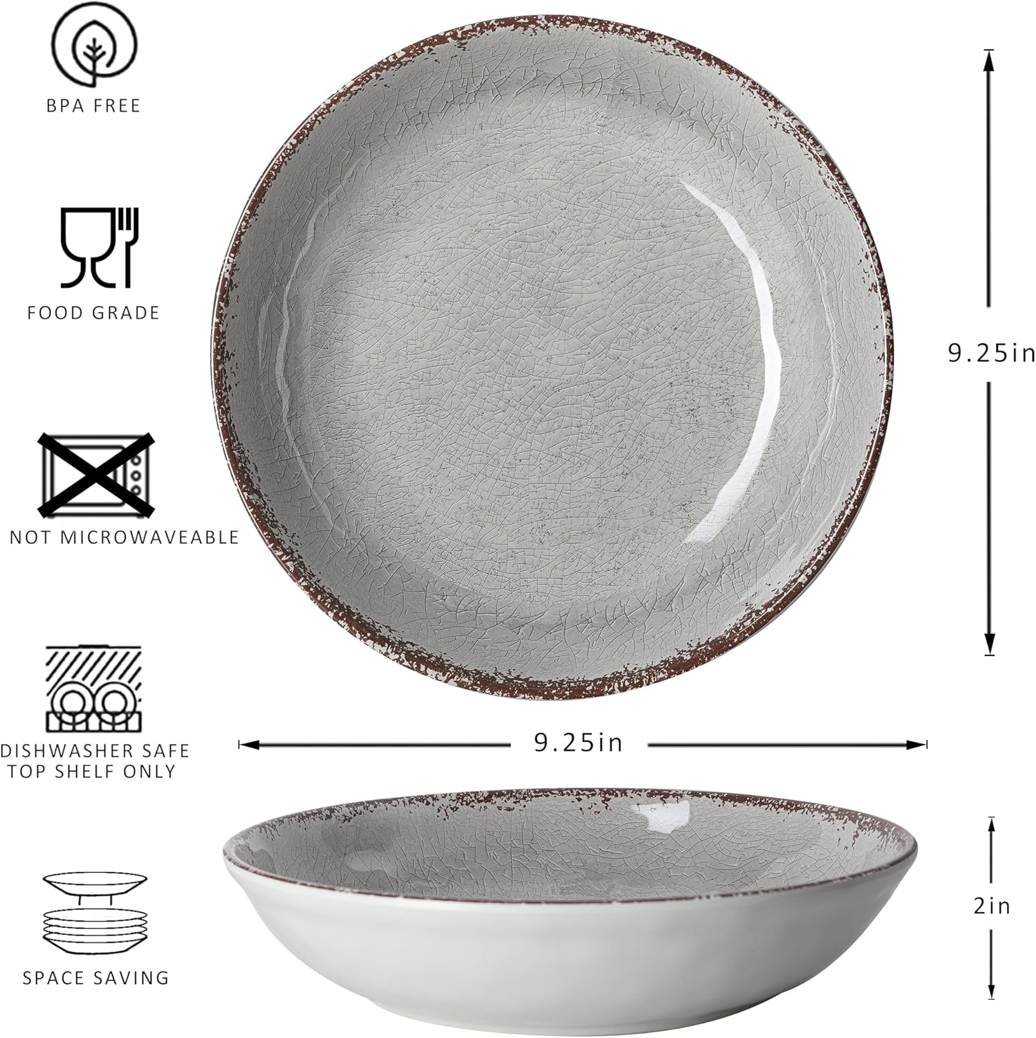 • FARMHOUSE DESIGN: These melamine pasta bowl has crackle pattern with brown rustic rim looks like a antique and 100% pure melamine material re-create the subtle texture, rubbed edges and rich glazed finish of ceramics in durable, scratch-resistant melamine.