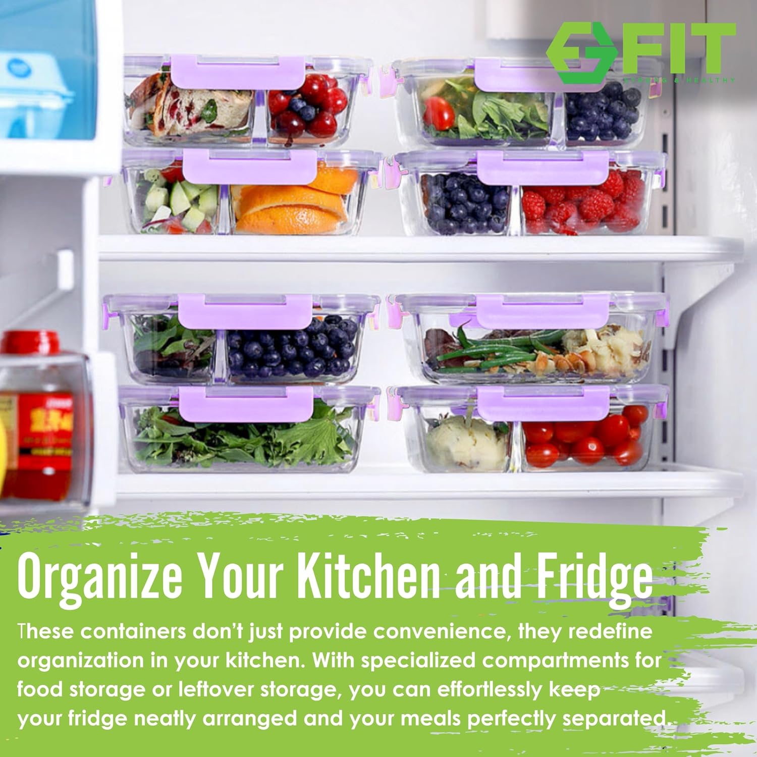 2 & 3 Compartment Glass Meal Prep Containers (4 Pack, 32 oz) - Glass Food Storage Containers with Lids, Bento Box, Portion Control, Airtight, Oven & Freezer safe, Food Container, Lavender