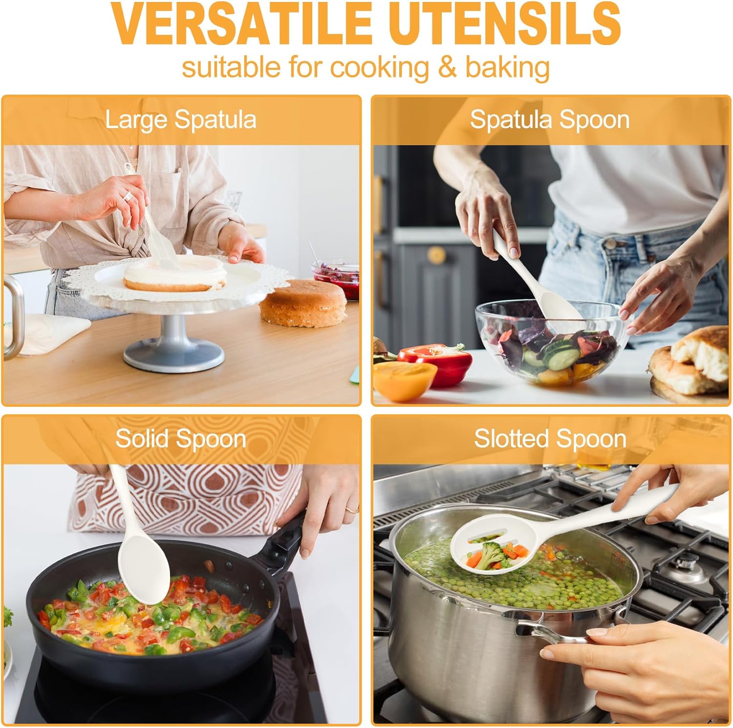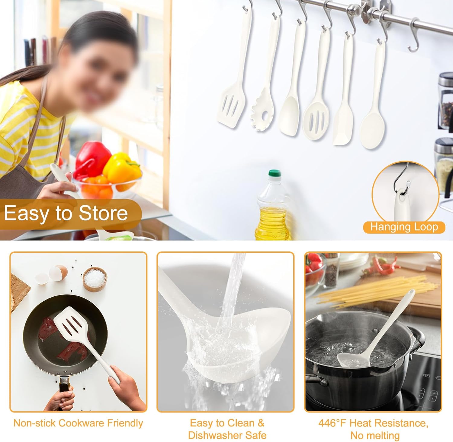 • One-Piece Seamless Design: The silicone cooking utensils set with seamless one-piece construction, No worry about the top coming off or food trapped, Solid long handle would not bend and easy to grip, Sturdiness and usability help cooking easier, A good substitution for two piece silicone utensil, White colored utensil set brightening your kitchen counter