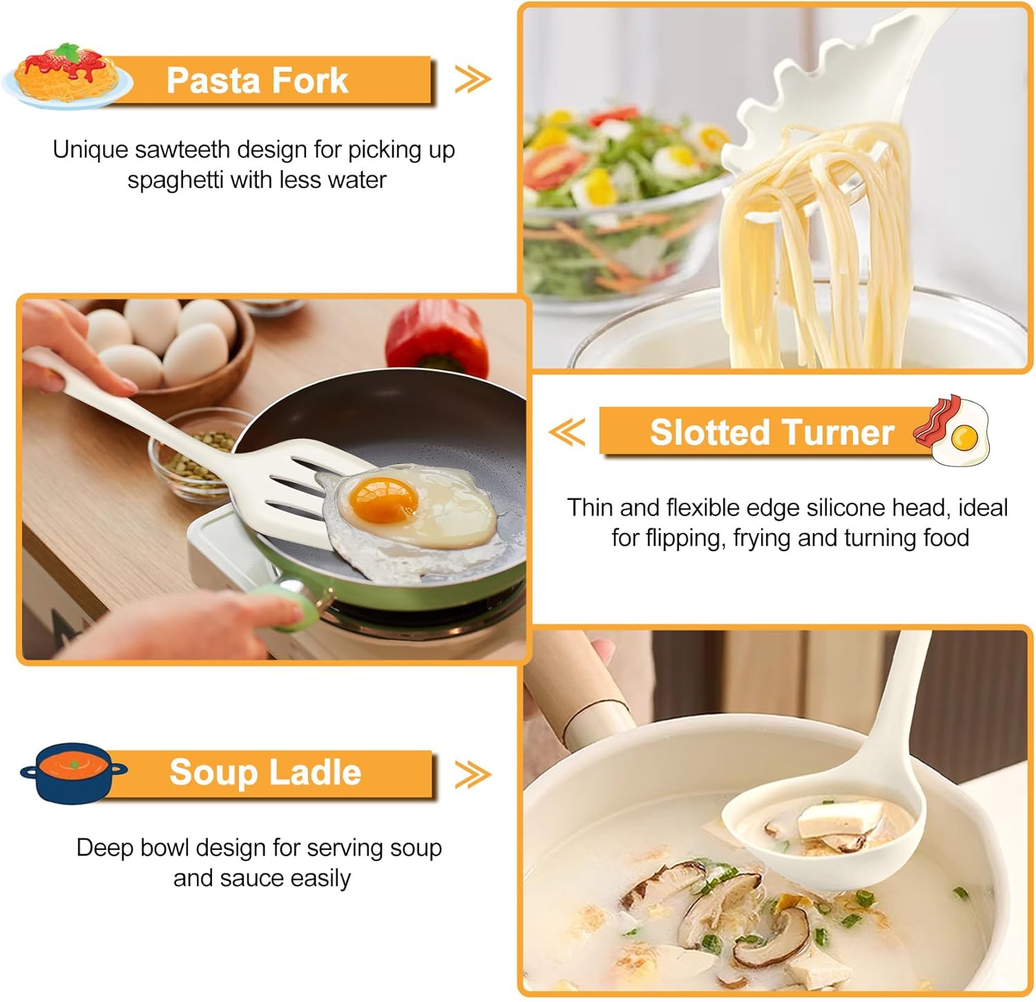 • Multi-Use: The silicone kitchen utensils set of 7 with different function, Sufficient for your daily kitchen tasks, Thin and flexible edge of the silicone Slotted Turner is ideal for flipping and turning food, Soup Ladle for serving soup and sauces, Slotted and Solid spoon for mixing salad, Pasta Server can easy pick up spaghetti, Large Spatula and Spatula Spoon for mixing cream or hot chocolate sauce