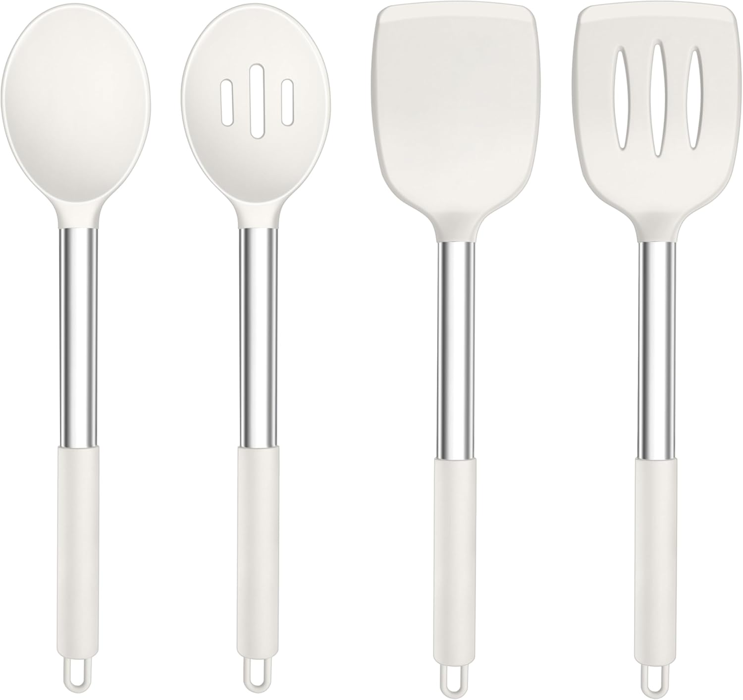 TeamFar Kitchen Utensils, 4 PCS Silicone Cooking Utensils with Stainless Steel Handle, for Nonstick Cookware Frying/Flipping/Draining, Non-toxic & Heat-proof, Non-scratch & Dishwasher Safe