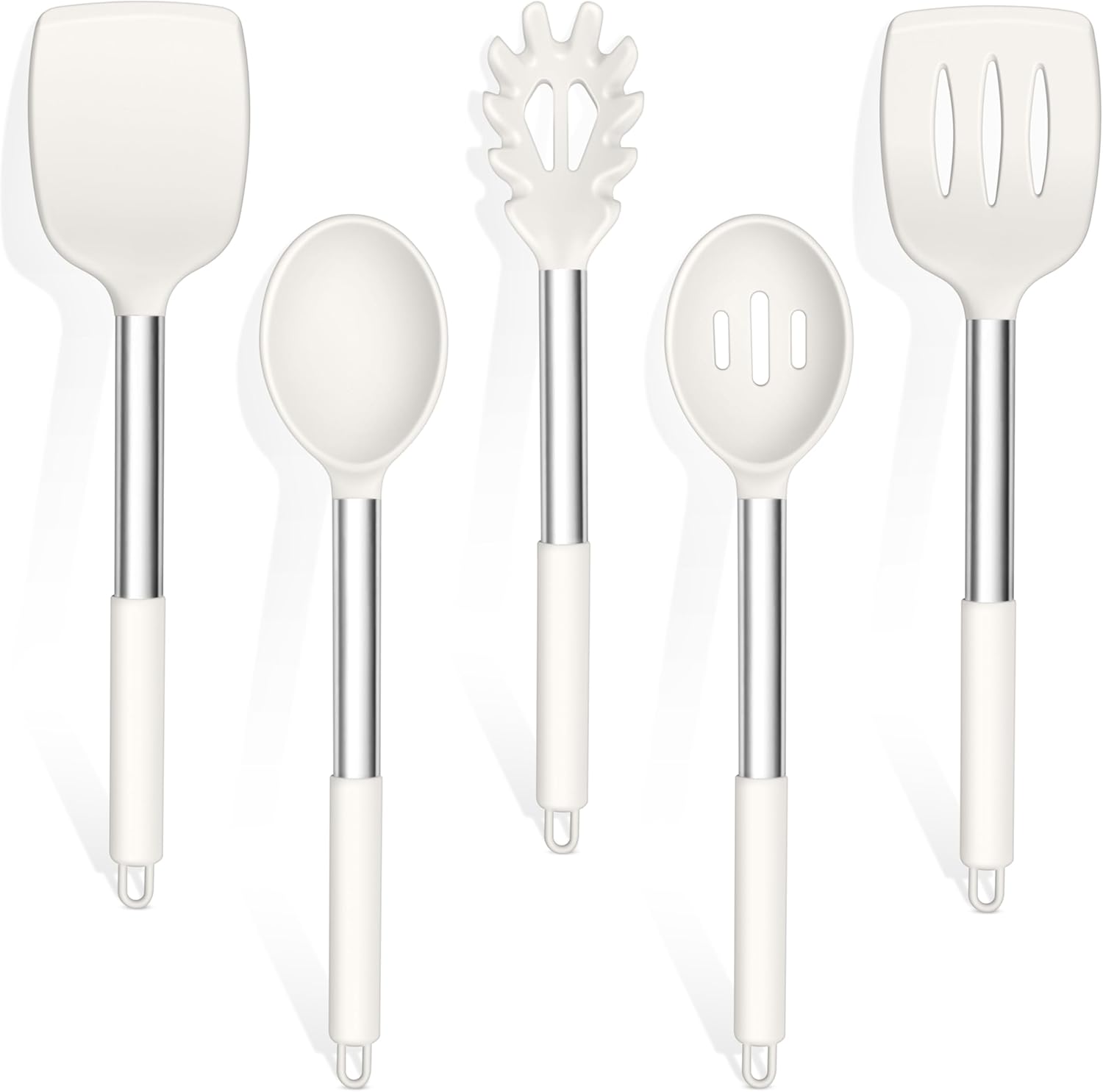 TeamFar Cooking Utensils Set, 5 Pcs Silicone Kitchen Utensils with Stainless Steel Handle, for Nonstick Cookware Flipping Frying Turning Draining, Heatproof & Healthy, Healthy & Easy Clean, White