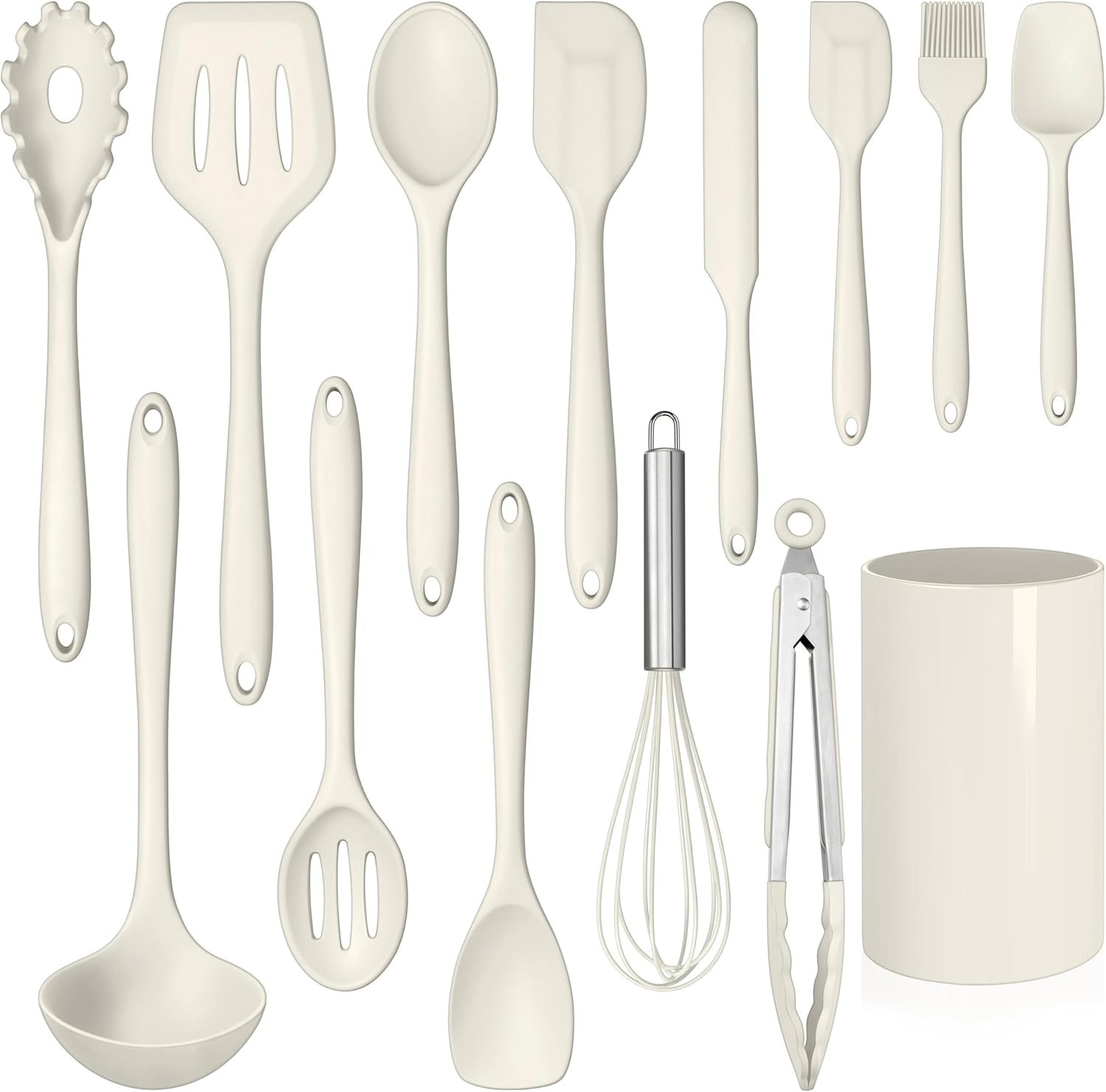 LIANYU 14 Pcs Kitchen Utensils Set with Holder, Silicone Cooking Utensils Spatula Set, Heat Resistant Cookware Tools Includes Spoon Turner Whisk Tong, Dishwasher safe, Cream White