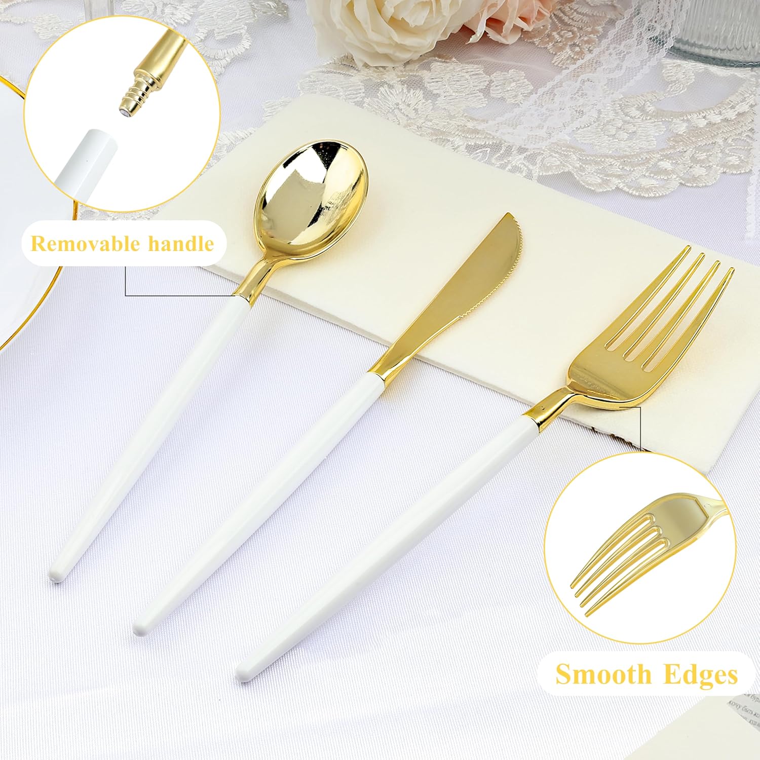 • Exquisite Design: These plastic utensil sets are beautifully crafted with an elegant design; the gold silverware features a smooth surface, showcasing a two-tone color scheme of gold and white; elevate your party to with our disposable utensils