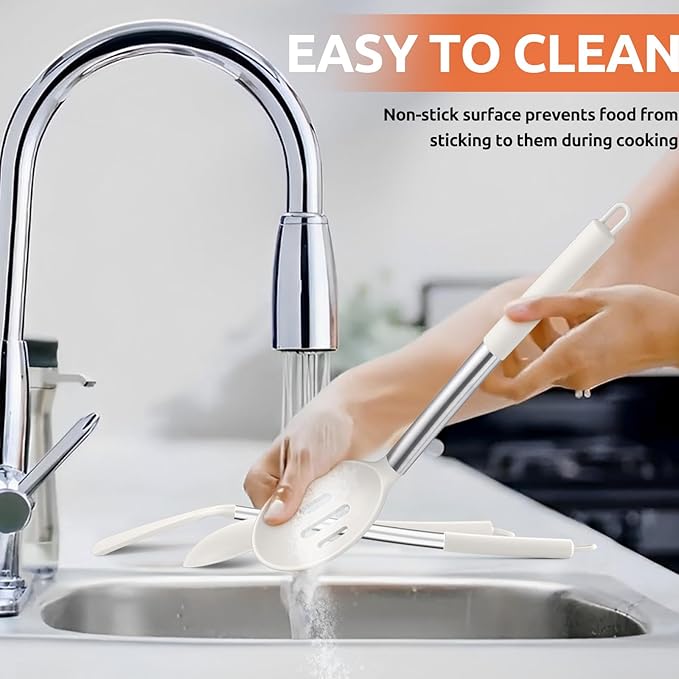 • EASY TO CLEAN & STORE - Non-stick silicone surfaces make food harder to stick to during cooking compared to wooden utensils, Easy to clean by hand and dishwasher safe, Hanging loop attached to the handle for easy storage, Keep your drawer space clear of clutter, Ideal gift for Christmas, Thanksgiving, housewarming