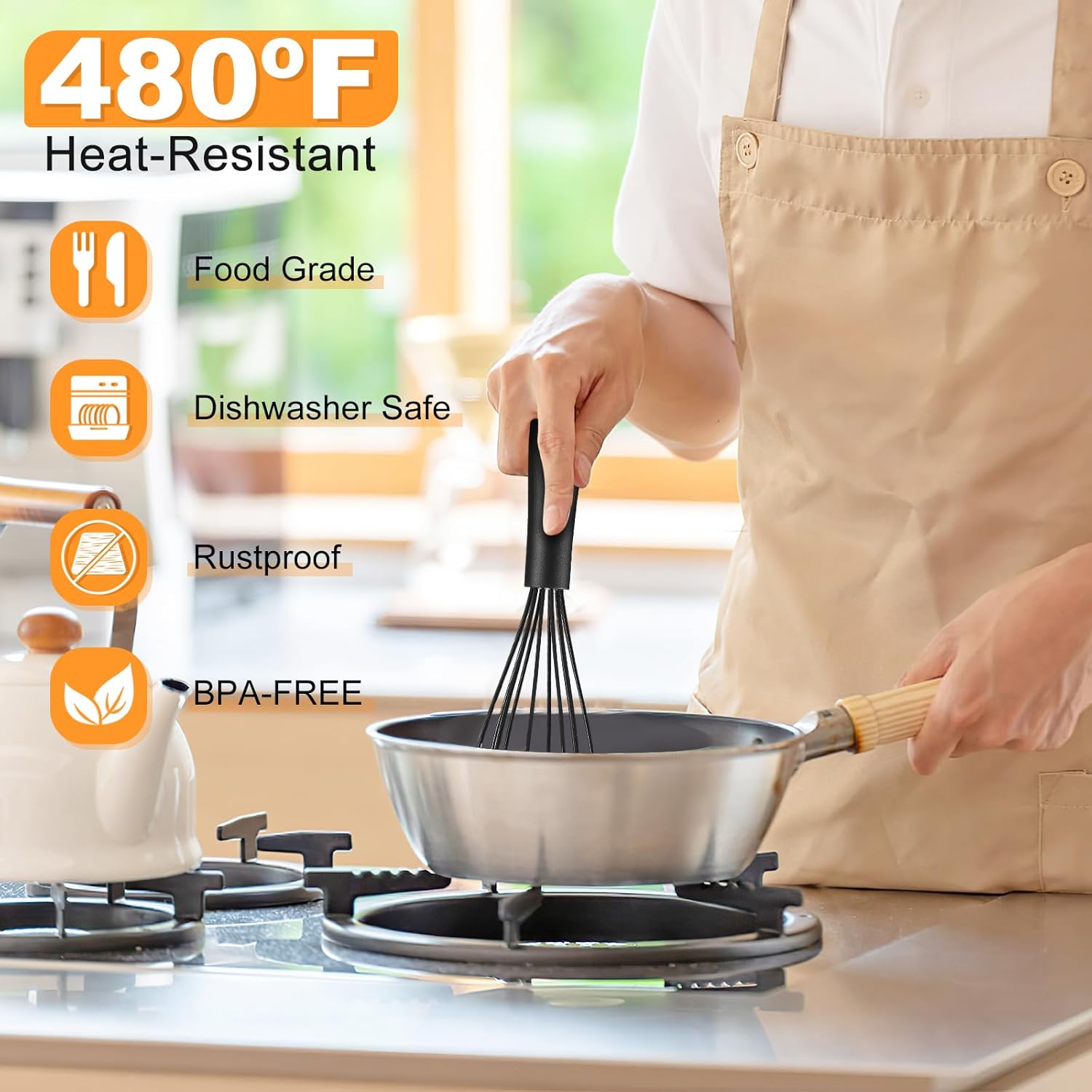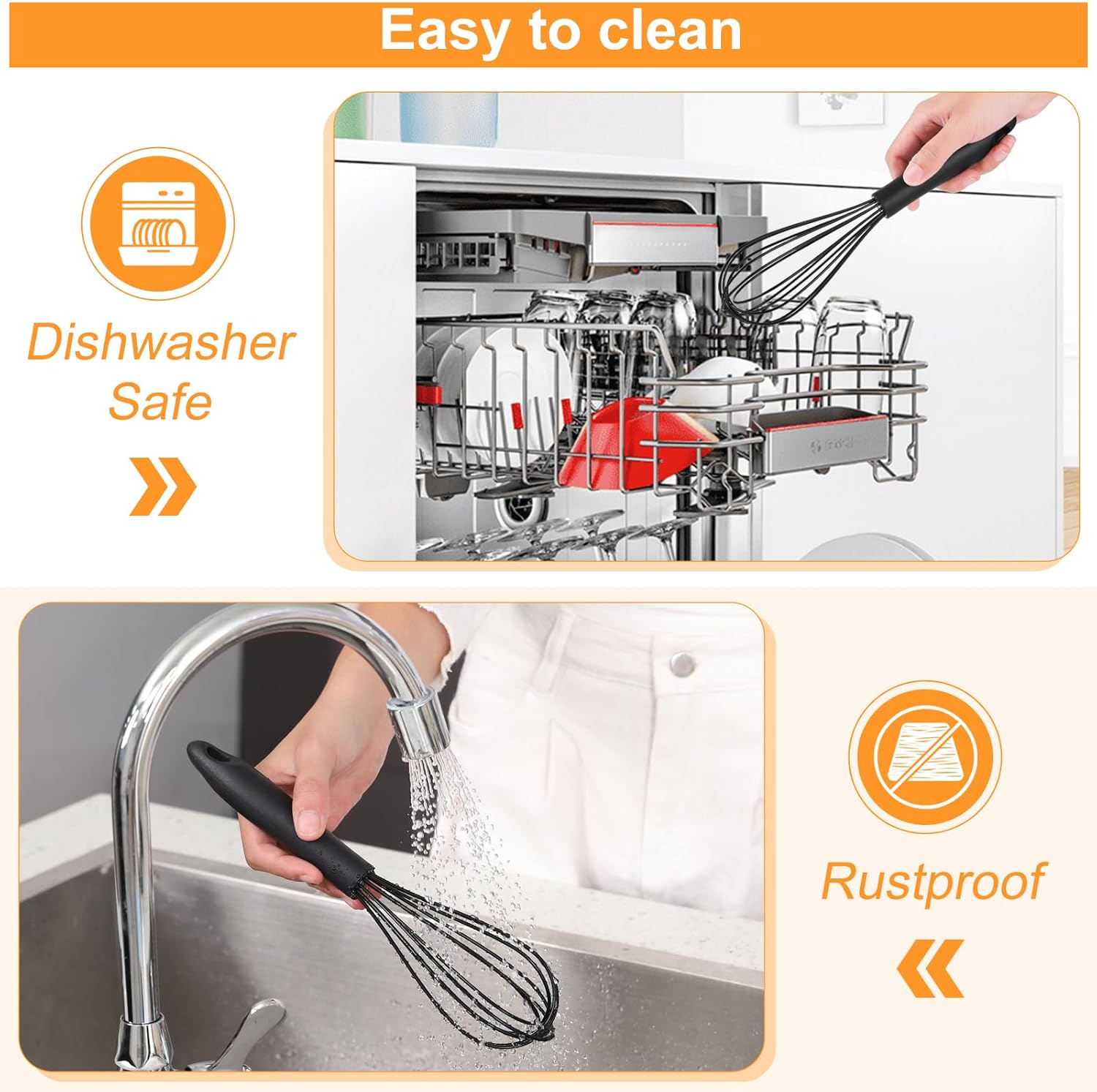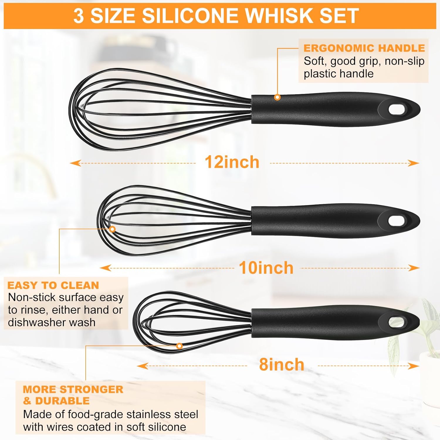 • 【484ºF High Heat-Resistant】➤The silicone whisks for cooking are highly heat-resistant,can typically withstand temperatures up to 484°F (260°C).This makes them suitable for use directly in hot pots and non-stick pans without the risk of melting or warping.The wire whisk set comes in 3 different sizes: 12 inch, 10 inch, 8 inch,Variety of sizes are suitable for use in a variety of cooking situations,Great for beating eggs,blending batters, aerating cream, whipping hot sauces and gravies,mixing ingredients in a hot pan,and whisking over a stovetop.