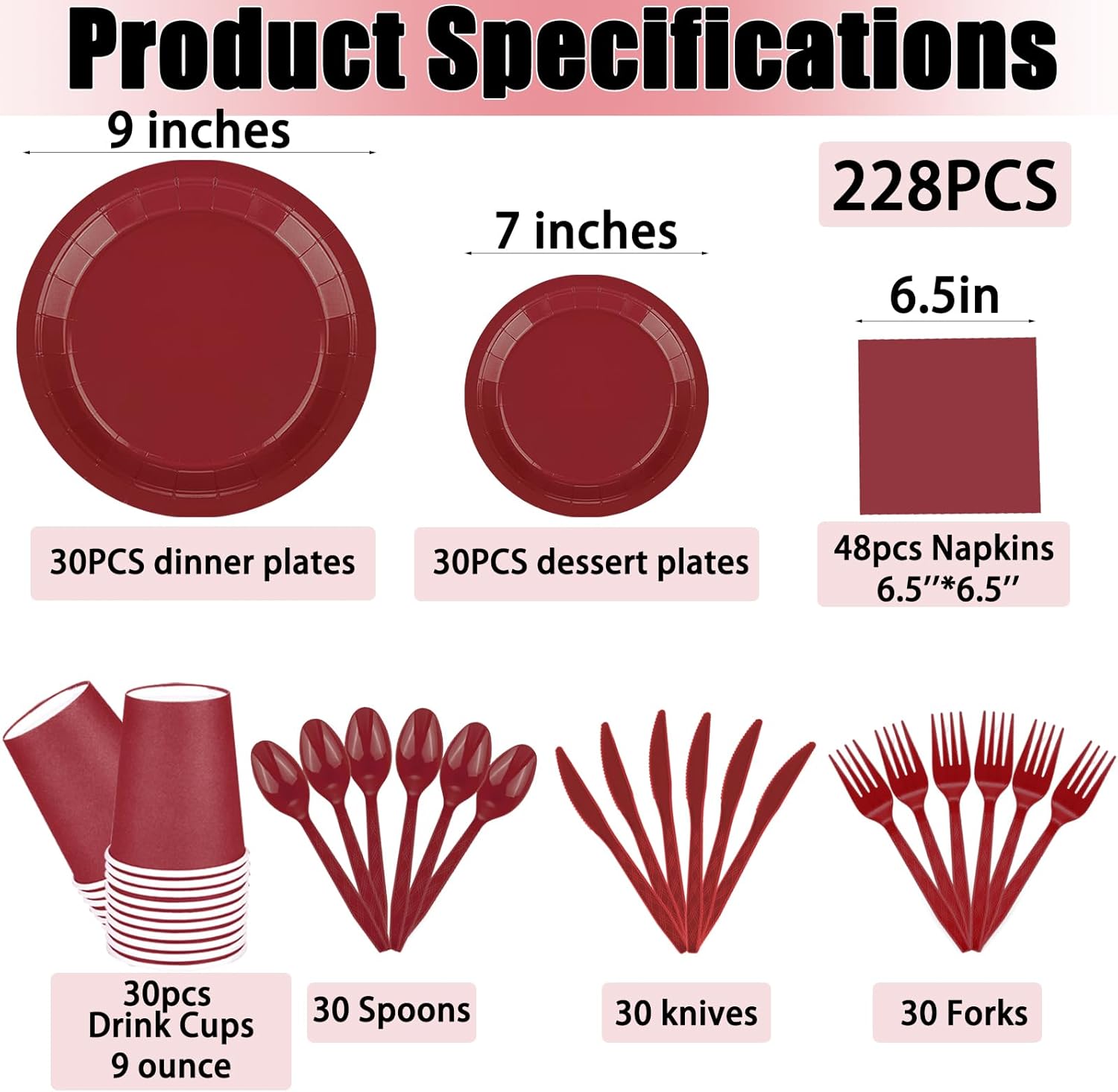 TWOWYHI 228PCS Burgundy Party Supplies Set Include Paper Plates Cups Paper Napkins Plastic Spoons Forks Knives for 30 Guests Disposable Party Dinnerware for Birthday Wedding Family Picnic