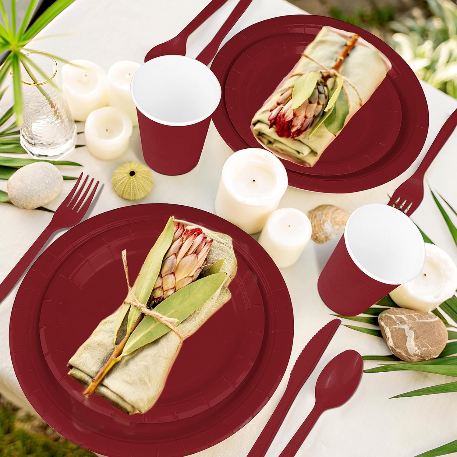 • Burgundy Party Supply Set: The burgundy party supply set with 30 each of 9 inch burgundy paper plate, 7 inch party paper plates, 9 oz paper cups, plastic forks, spoons, knives, and 48 pieces paper napkins, party plates set ensures table is ready for party