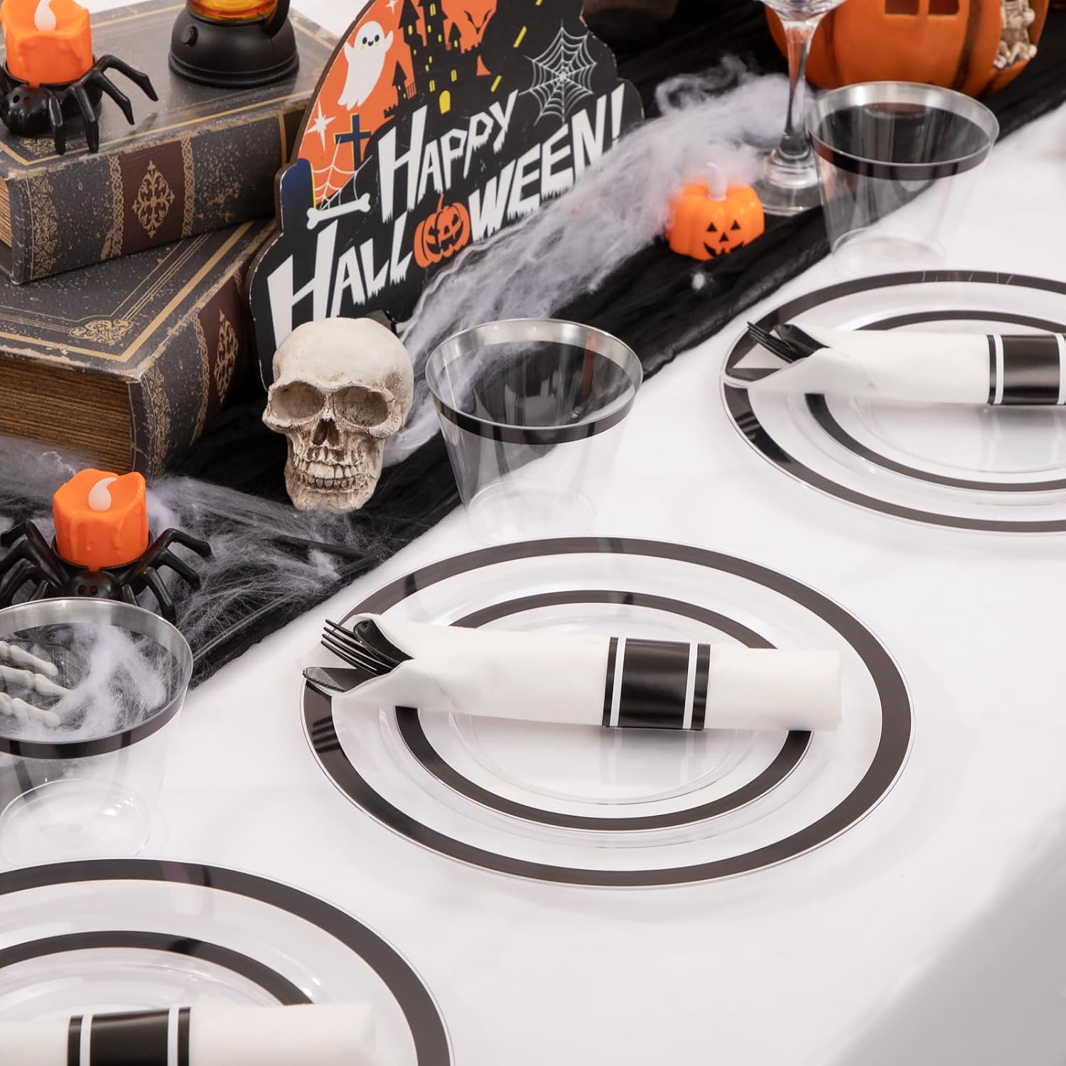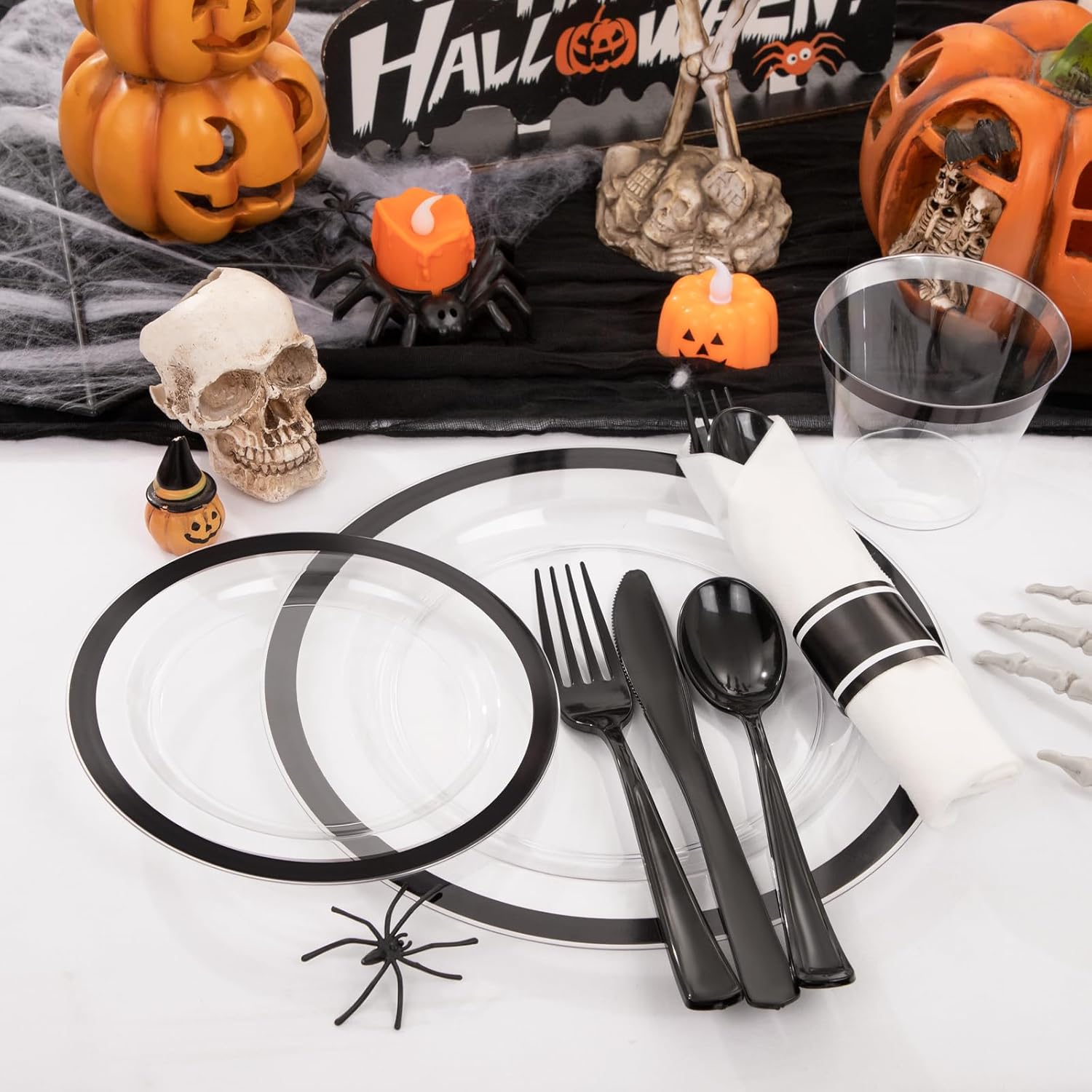 • FASHIONABLE AND ELEGANT DESIGN - Liacere 350PCS clear black plastic plates set, with classic black edges on the clear plastic plates, adds a modern touch to your event, especially suitable for Halloween parties and other celebrations, making your dining table more tasteful